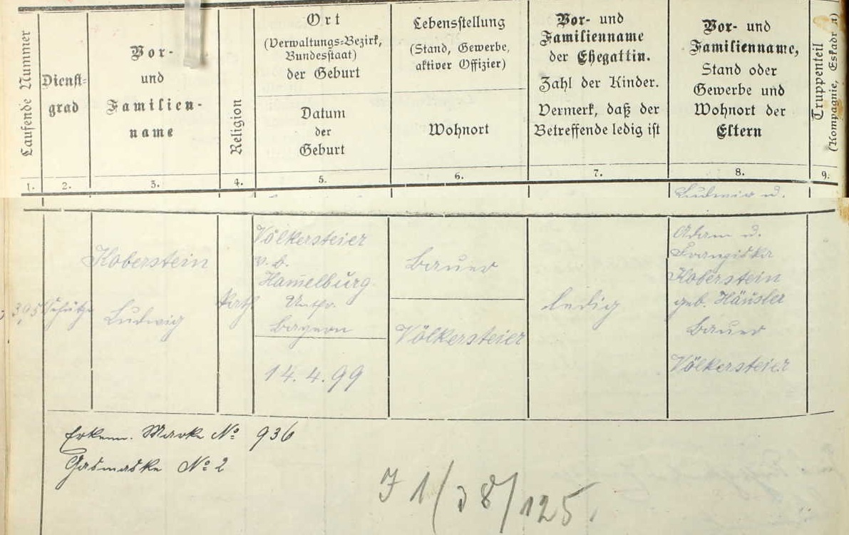 Birth Date: 14 Apr 1899 Birth Place: Völkersleier Hamelburg Combat Arm: Infanterie Type of Unit: Infanterie-Regimenter Unit: 8. bayer. Infanterie-Regiment Volume: 1015. Kriegstammrolle: Bd. 2