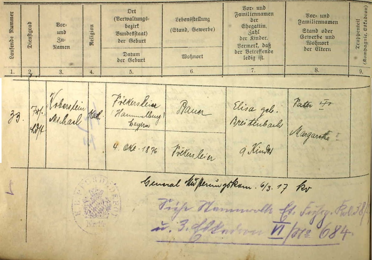 Birth Date: 4 Okt 1896 (4 Oct 1896) Birth Place: Vilkershein (Hammelburg) Bayern (Bavaria) Combat Arm: Train-Formationen Type of Unit: Feld-Truppenteile: Pferde-Depots Unit: bayer. Pferde-Depot 10 Volume: 19275. Kriegsstammrolle