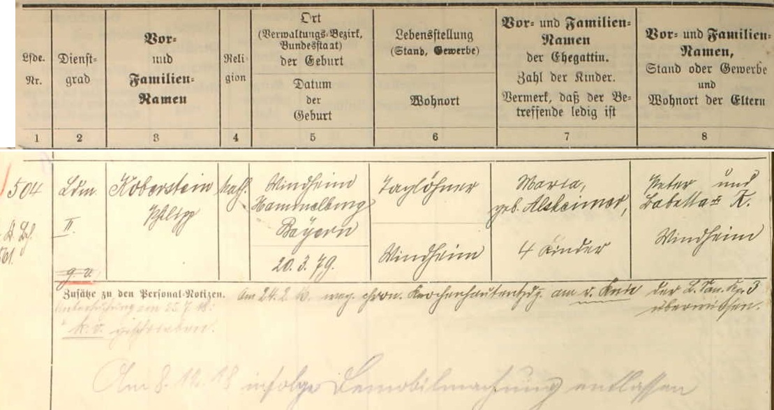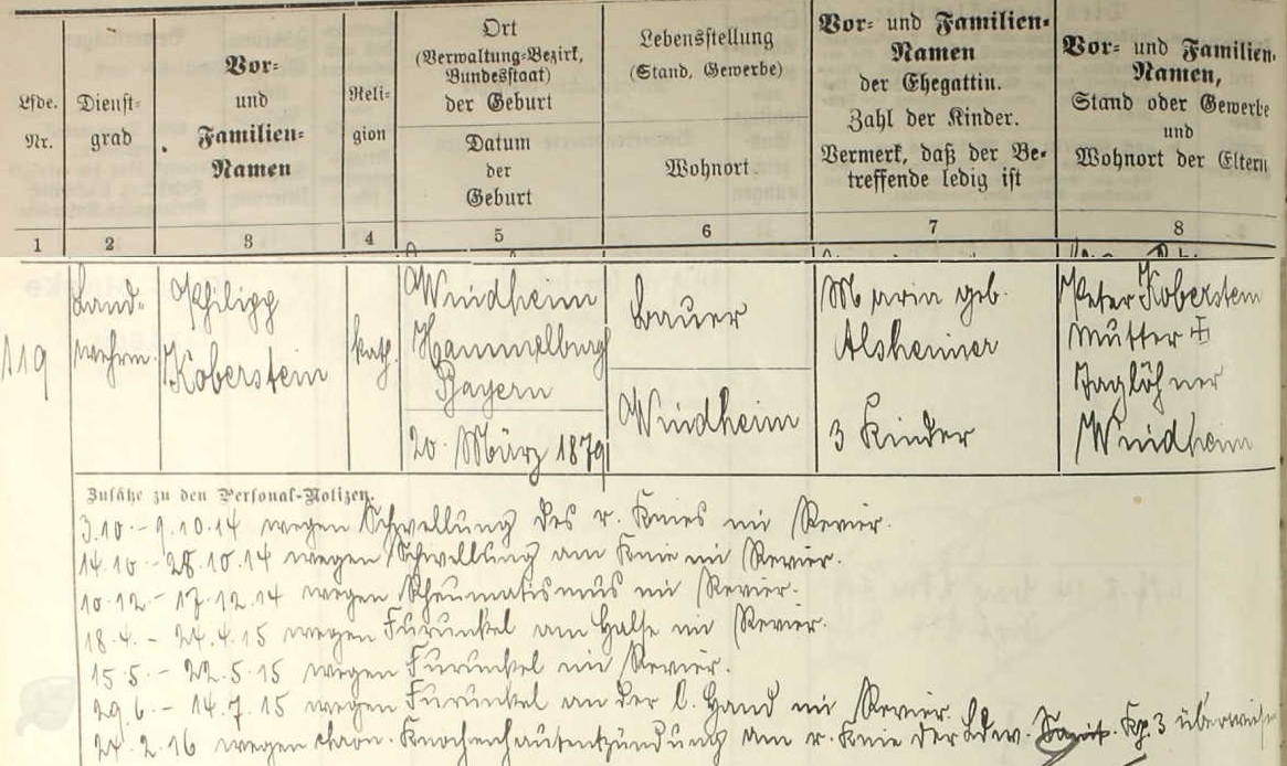 Birth Date: 20 Mrz 1879 (20 Mar 1879) Birth Place: Windheim Hammelburg Bayern (Bavaria) Combat Arm: Infanterie Type of Unit: Landwehr-Infanterie-Regimenter Unit: Bayer. Landwehr-Infanterie-Regiment Nr. 4 (Landau/Pfalz) Volume: 3609. Kriegstammrolle: 4. Kompanie