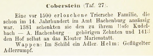 Translation: An extinct before 1500 Triersche family in the 14th Century in office Hachenburg was resident. In 1381 they gave the court her Kudelbach - A. Hachenburg - belong tithes and 1413 the Court itself to the monastery Marie instead. Coat of arms: In the shield an eagle. Helmet: winged eagle hull.