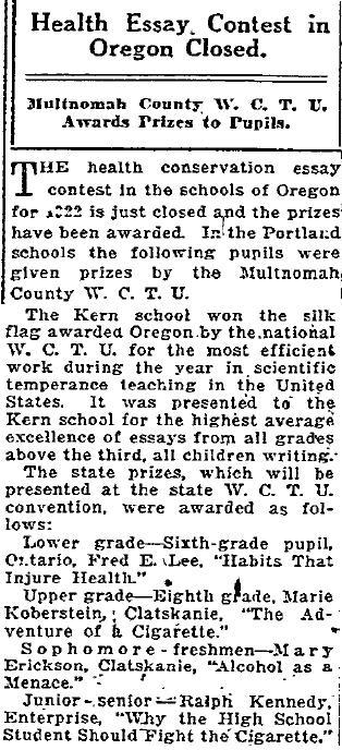 Health Eassy Contest Oregon Closed. Multnomah County W. C. T. U. Awards (News Article)