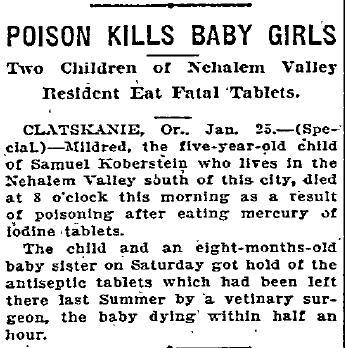 Poison Kills Baby Girls Two Children of Nehalem Valley Resident Eat Fatal Tablets (News Article)