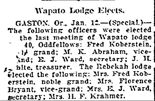 Appears that Fred Koberstein was elected noble grand in the Oddfellows and his wife to noble grand in the Rebeckah Lodge of Wapato.