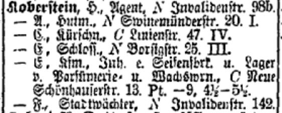 A., Kufm., N SwinemünderStr. 20 I. C., Kürschn(er)., C LinienStr. 47. IV. F., Schloss.(er), N BorsigStr. 25 III. F., Kfm., Inb.(Inhaber) e. Seifenfbrt.(Seifenfabrik) u. Lager v. Parfümerie. u. Wachswrn.(Wachswaren), C Neue SchönhauserStr. 13. Pt. 9, 4 ½ 5 ½ . (Parfümerie is the profession of perfume- shopkeeper, Kfm. is abbreviation for Kaufmann ie. a businessman, A businessman and proprietor of a soap facotry and a perfume store, with articles of wax) F., Stadtwächter, N InvalidenStr. 142. |