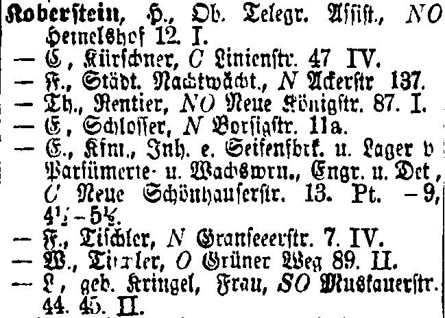 C, Kürschner, C LinienStr. 47. IV. F, Stadt. Nachtwächt., N AckerStr. 137 Th., Rentier, NO Neue KönigStr. 87 I. F., Schlosser, N BorsigStr. 11a. F., Kfm., Inb.(Inhaber) e. Seifenfbrt.(Seifenfabrik) u. Lager v. Parfümerie. u. Wachswrn.(Wachswaren), Engr u. Det., C Neue SchönhauserStr. 13. Pt. 9, 4 ½ 5 ½ . (Parfümerie is the profession of perfume- shopkeeper, Kfm. is abbreviation for Kaufmann ie. a businessman, A businessman and proprietor of a soap factory and a perfume store, with articles of wax) F., Tischler, N OranseeerStr. 7. IV. W., Tischler, O Grüner Weg 89. II. L., geb. Kringel, Frau, SO MuskauerStr. 44. 45. II. |