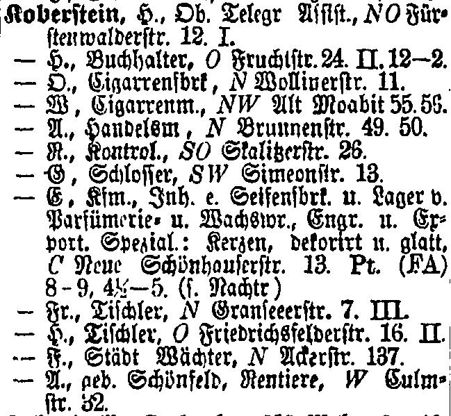 H., Buchhalter, O FruchtStr. 24. II. 12-2. O, Cigarrensbrt., N WollinerStr. 11. W., Cigarrenm., NW Alt Moabit 55.56. A., Handelsm., N BrunnenStr. 49. 50. R., Kontrol., SO SkalitzerStr. 26. G., Schlosser, SW SimeonStr. 13. F, Kfm, Inh. e. Seifenfbrt. u. Lager v. Parfümerie u. Wachswr, Engr. u. Frport.. Spezial.: Kerzen, defortrt u. glatt, C Neue SchönhauserStr 13. Pt (FA) 8-9, 4 1/2-5. (F. Rachtr) Fr, Tischler, N OranseeerStr. 7. III. K., Tischler, O FriedrichsfelderStr. 16. II. F., Städt. Wächter, N AckerStr. 137. A., geb. Schönfeld, Rentiere, W CulmStr. 32. |
