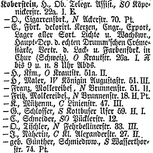 O., Cigarrenfbrt., N AckerStr. 70. Pt. F., Fbrt. beforirt. Kerzen, Engr., Export, Lager aller Sort. Lichte u. Wadismr., haupt: Dep. v. echten Drummjdien Crêmestarte, Bertr. d. Lad. u. Tarbenfbrt. in Thur (Schmeiz), O KrautStr. 26a. I. A bis 9 u. n. 8 llhr Abbs. H., Kfm., O KrautStr. 51a. H, Maler, W Königin AugustaStr. 51.III. Franz, Molkereibes., N BrunnenStr. 51. H. Fritz, Molkereibes., N BrunnenStr. 18 H. Pt. G., Scholsser, S Kottbuser 11fer 59. H. I. C., Schneider, SO PücklerStr. 12. O., Tischler, N FehrbellinerStr. 33. F., Naherin, C Kl. AleranderStr. 27. II. geb. Günther, Ww., S WasserthorStr. 74. Pt. |