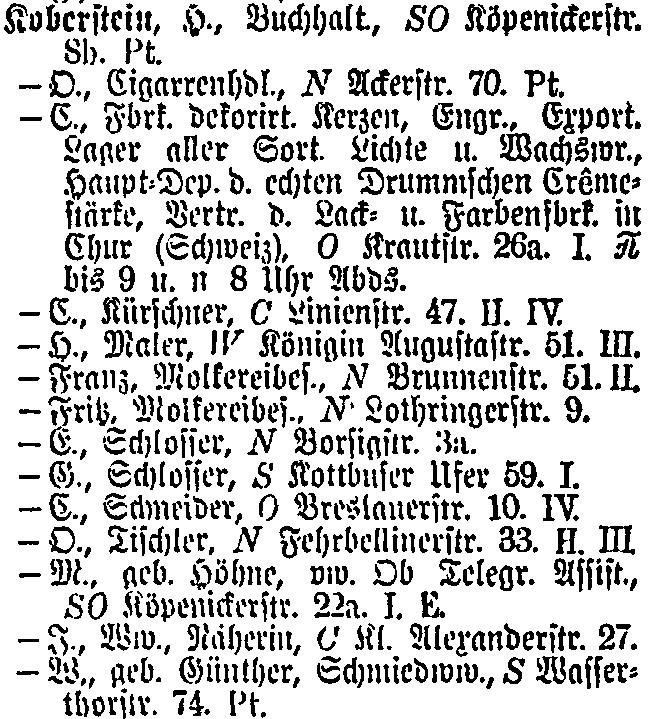 O., Cigarrenhdl., N AckerStr. 70. Pt. F., Fbrt. beforirt. Kerzen, Engr., Export. Lager aller Sort. Lichte u. Wachsmr., haupt: Dep. v. echten Drummschen Crêmestärte, Bertr. v. Lad. u. Farbensbrt. in Thur (Schweiz), O KrautStr. 26a. I. A bis 9 u. n 8 Uhr Abbs. C, Kürschner, C LinienStr. 47. II. IV. H., Maler, IV Königin AugustaStr. 51. III. Franz, Molkereibes., N BrunnenStr. 51. II. Fritz, Molkereibes., N LothringerStr. 9. F., Schlosser, N BorsigStr. 3a. G., Scholsser, S Kottbuser 11fer 59. I. C., Schneider, O BreslauerStr. 10. IV. O., Tischler, N FehrbellinerStr. 33. II. III. M., geb. Höhne, viv. Db Telegr. Assist., SO KöpenickerStr. 22a. I. E. J., Ww. Kaherin C K1. AlexanderStr. 27. W., geb. Günther, Schmiediviv., S WasserthorStr. 74. Pt. |