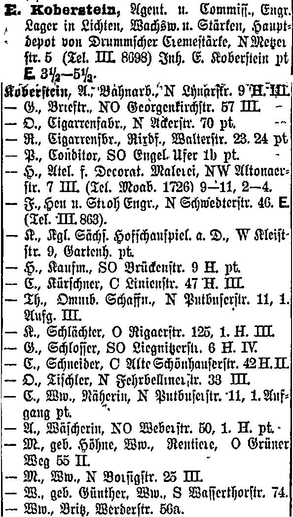 A.., Bahnarb. (railway worker), N Lynarstr. 9 H, ML. G., Brieftr., (brief=letter; possibly a postman) NO(north-east) GeorgenkirchStr. 57 IIL O (Oscar), Cigarrenfabrikant, (proprietor of a cigarfactory) N(north) Ackerstrasse 70. Pt. R (Reinhold), Cigarrenfbr. (proprietor of a cigarfactory) Rirdorf (?)., WalterStr. 23. 24 pt P., Conditor, (pastrycook, owner of a confectioners shop) SO(south-east) Engel Ufer 1b pt. H., Atel. f. Decorat. Malerei, NW(norh-west) Altonaerstr. 7 III. (Tel. Moab 1726) 9-11, 2-4. (proprietor of a workshop for decorative paintings and arts) F., Heu u. Stroh Engros, N(north) Schwedterstr. 46. E. (Tel. III.863) K., Kgl. Sächs. Hoffchauspieler a. D., W (west) KleistStr. 9. Gartenh. Pt. (entrance through the garden) (Royal Actor at the Royal Theatre of Dresden, Saxony) H., Kaufm. (businessman) SO(south-east) BrückenStr. 9 H. pt. C., Kürschner (furrier, peltmonger or fur-tradesman), C(central) Linienstr. 47 H. III. Th.., Omnib.. Schaffn,. (probably omnibus chauffeur, driver in a sort of tramway) N(north) PutbuserStr. 11, 1. Aufg. (entrance)III. K., Schlächter (butcher), O(east) RigaerStr. 125. 1. H. III. G (Gustav)., Schlosser (locksmith or fitter), SO(south-east) Liegnisserstr. 6 H. IV. C., Schneider (taylor), C(central) Alte SchönhauserStr. 42 H. IL O., Tischler (carpenter), N(north) Fehrbellinerstr. 33 III. C., Ww. (widow), Räherin (?),N(north) PutbuserStr. 11, 1. Aufgang pt. (indicates the entrance) A., Wäscherin (laundress or washerwoman), NO(north-east) WeberStr. 50, 1. H. pt. M., born Höhne, a widow, proprietor, O(east) Grüner Weg 55 II W., geb. Günther, Ww. S WasserthorStr. 74. Widow, Britz, Werderstrasse 56a. |