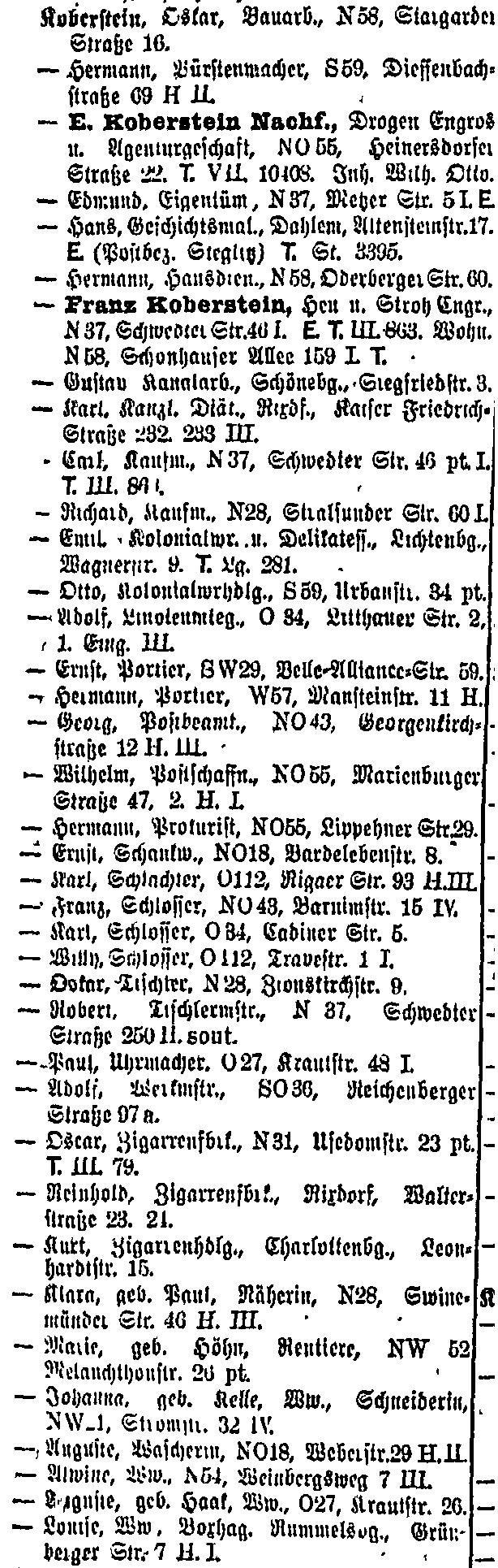 Hermann, Bürstenmacher, S59, Dieffenbach Strasse 69 H II. E.Nachf., Drogen Engrvs u. Agenturgeschaft, NO 55 Heinersdorfer Strasse 22. T. VII. 10408. Inh Wilh. Otto. Edmund, Eigentüm, N37, Metzer Str. 5 I. E Hans, Beschichtsmal., Dahlem, AltensteinStr. 17. E (Postbez. Steglez) T. St. 3395. Hermann, Hausdien., N58, OderbergerStr. 60 Franz, heu u. Stroh Engr., N37 Schweder Str. 46 I. E. T. III 863. Wohn. N 58, Schonhauser Allee 159 I. T. Gustav Kaualarb., Schönebg., SiegfriedStr. 3. Karl, Kanzl. Diät., Kirbf., Karfer FriedridjStrasse 232 233 III. Carl, Kaufm., N37, Schwedter Str. 46 pt. I. T. III. 891. Richard, Kaufm., N28, Shalfunder Str. 60 L. Emil, Kolonialwr., u. Delisatess., Lichtenbg. Wagnerstr. 9. T. Lg. 281. Otto, Kolonialwrhdlg., S59, UrbanStr. 34 pt. Adolf, Linoleumleg., O 34, Litthauer Str. 2. 1. Eing. III. Ernst, Portier, SW29, Belle-Alltance-Str. 59. Hermann, Portier, W57 MansteinStr. 11 H. Georg, Postbeamt., NO 43, GeorgenkirchStrasse 12 H. III. Wilhelm, Postschassn., NO 55, MarienburgerStrasse 47, 2. H. L. Hermann, Proturist, NO55, LippehnerStr.29. Ernst, Schanhv., NO 18 BardelebenStr. 8. Karl, Schlachter, O112, Rigaer Str. 93 H.III. Franz, Schlosser, NO43, BarnimStr. 15 IV. Karl, Scholosser, O34, Cadiner Str. 5. Willy, Schlosser, O112, TraveStr. 1 I. Oskar, Tischter, N28, ZionskirchStr. 9. Robert, Tischlermftr., N37, SchwedterStrasse 250 II. sout. Paul, Uhrmacher, O27, KrautStr. 48 I. Adolf, Weifmftr., SO36, ReichenbergerStrasse 97a. Oscar, Cigarrenfbrt., N31, UsedomStr. 23 pt. T. III. 79. Reinhold, Cigarrenfbrt., Rirborf, WalterStrasse 23. 21. Kurt, Cgarrenhdlg., Charlottenbg., LeonhardtStr. 15. Klara, geb Paul, Käherin, N28, Swinemünder Str. 46 H. III. Marie, geb Höhn, Rentiere, NW 52 MelanchthonStr. 26 pt. Johanna, geb. Kelle, Ww., Schneiderin, NW_1, Stromstr. 32. IV. Auguste, Wasdjerin, NO18 WeberStr.29 H. II. Alwine, Ww., N54, Weinbergsweg 7 III. Auguste, geb. Hoak, Ww., O27, KrautStr. 26. Louise, Ww., Borhag. Kummelsug., Brünberger Str. 7. H. I. |