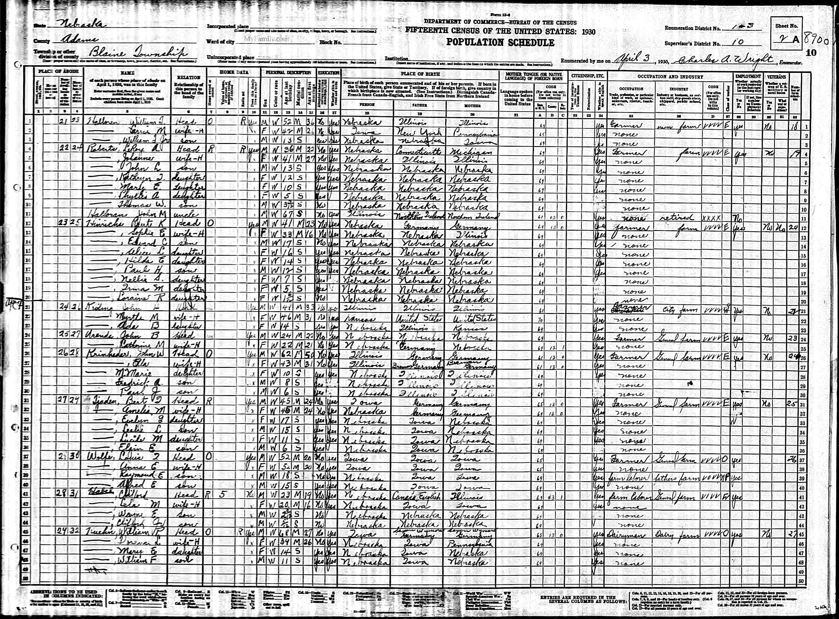Image source: Year: 1900; Census Place: West Blue, Adams, Nebraska;." Image.31930 US Census, NE, Ancestry.com. "Albert Bierman 48 1882 NE