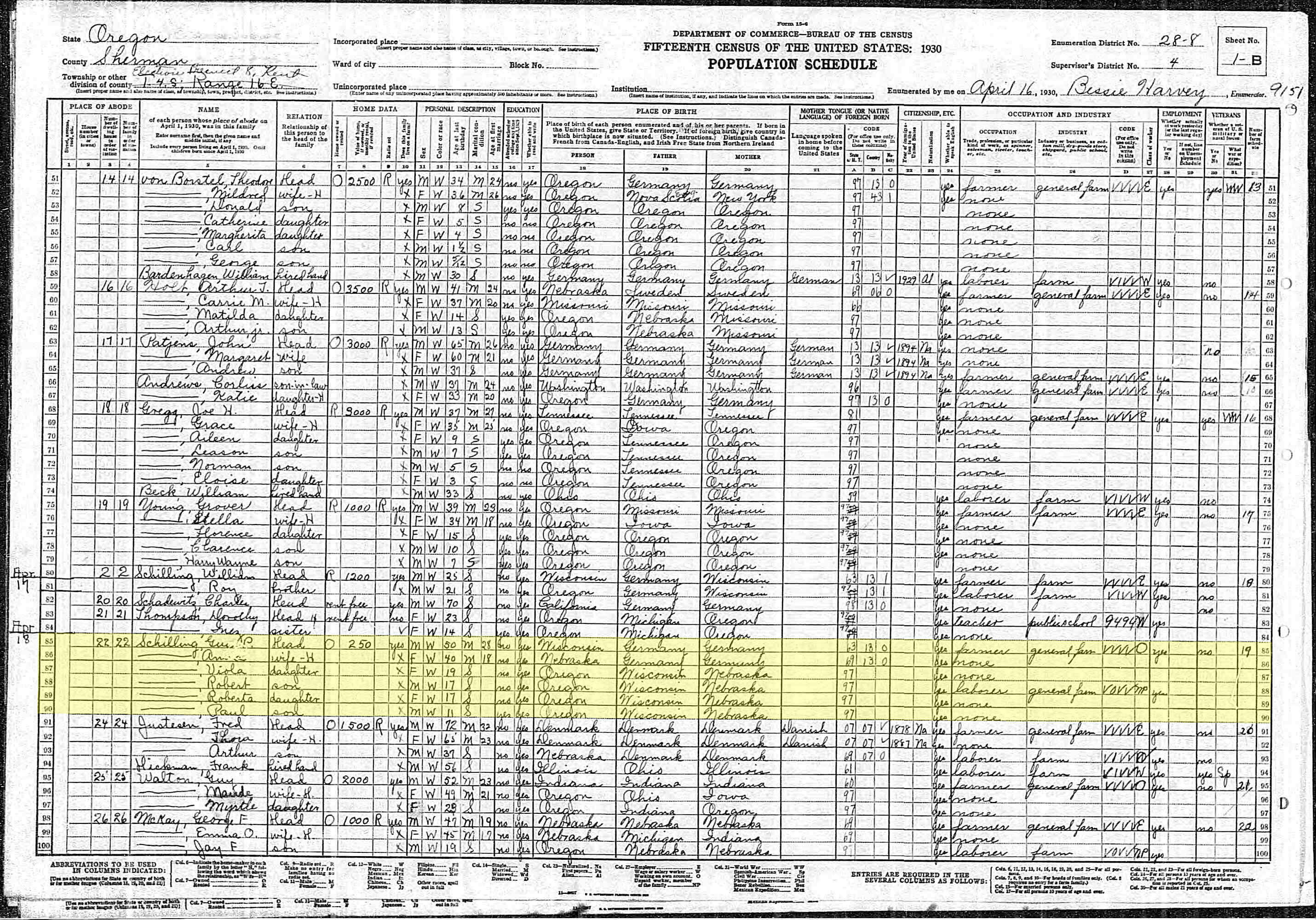 11930 US Census, OR, Ancestry.com. "Gus Shilling age 50, calc. birth year of 1880 in Wisconsin
