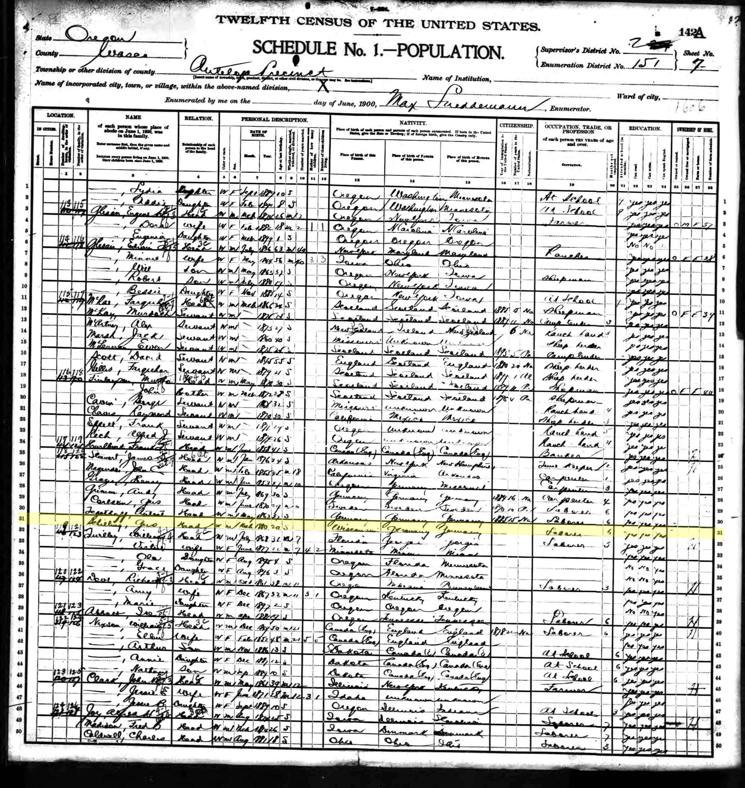 Paul age 11, calc. birth year of 1919 in Oregon." Image.21910 US Census, OR, Ancestry.com. "Gus Schilling: The 1900 census lists Gus as a 20 year old and laborer in Antelope, Wasco, Oregon about 8 miles south out of Shaniko, on a different road than the one to Madras, Oregon." Image.