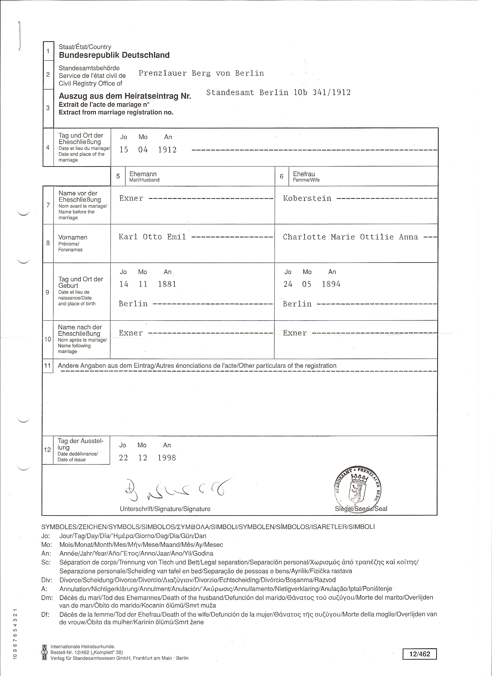 Charlotte married Karl Otto Emil EXNER on 15 Apr 1912 1 in Berlin, Germany 1. Karl was born 14 Nov 1881 in Berlin, Germany.