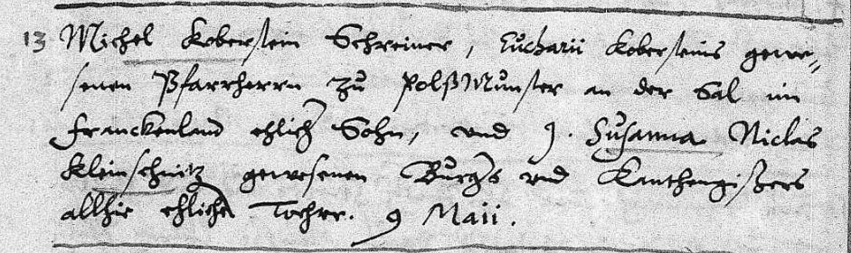 record title: Germany Marriages, 1558-1929 groom's name: Michel Koberstein bride's name: Susanna Kleinschnitz marriage date: 09 May 1603 marriage place: Heidelberg, Baden, Germany groom's father's name: Eucharii Koberstein bride's father's name: Niclas Kleinschnitz bride's marital status: Single indexing project (batch) number: M93414-2 system origin: Germany-EASy source film number: 1189252