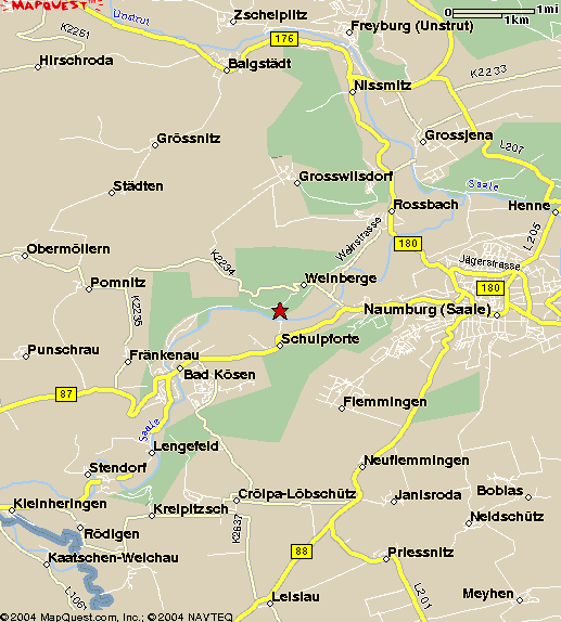 Location of Schulpforte (117.7 miles SW of Berlin, 5109 1145) where he taught and Bad Kosen where he died.
