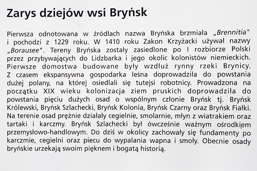 Outline of the history of the village of Brynsk First recorded in the sources, are Brynska name was "Brennitia" and comes from the year 1229. In 1410 the Teutonic Order used the name "Borausee". Brynska areas were settled after the partition of Poland by arriving German colonists to Lidzbarka and its surroundings. The first houses were built along the channel of the river Brynicy. In time, expansive sustainable forestry led to the formation of large clearings, no locals whom they settled workers. Conducted at the beginning of the nineteenth century colonization of Prussia led to the creation of five large settlements of a common member Brynska ie. Brynska Krolewski (Royal), Brynska Szlachecki (knighthood), Brynska Kolonia (Colonie), Brynska Czarny (Black) and Brynska Fialka (no polish translation but it is violet in Russian). No area of sediment rapidly, operated brickyards, distillers, mill with a windmill and sawmills and inns. Brynska Szlachecki (knighthood)was at that time an important center industrial-commercial. Today in the area are preserved foundations of the tavern, a brickyard, and a kiln lime and tar. Currently, the village Brynski captivate the beauty and its rich history.