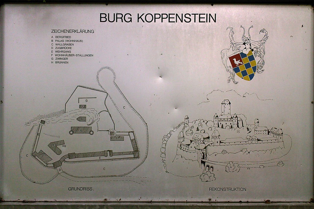 Here is the Wikipedia link for the castle. It icludes this interesting paragraph about eh Koppenstein family, "The von Koppenstein family named themselves after the castle . It came from an illegitimate son of Count Johann II von Sponheim-Kreuznach († 1340) (cf. LHAK Best. 700,219 No. 1) and was endowed with important castle and other fiefs by the County of Sponheim. ... The last male bearer of the Koppensteiner name, Jakob Adolf von Koppenstein († 1768), put his closest relative, Damian Freiherr Schenk von Schmidtburg, to his heir, to whom the largest part of the Koppenstein property fell. Jakob Adolf von Koppenstein returned the family's Sponheim fiefs to the County of Sponheim in 1759. They were lent to his cousin Franz Karl von Hacke (son of Baron Ludwig Anton von Hacke ). Today the ruins and castle district, including Gemünden Castle, belong to the descendants of the Schmidtburger, the barons of Salis .' Here is more detail in a wikipedia about the Kopperstein family.