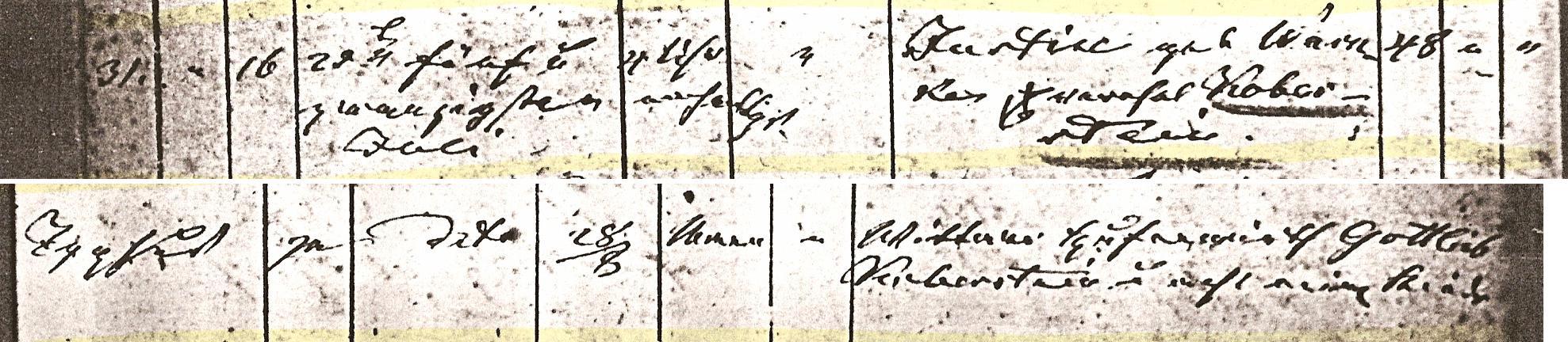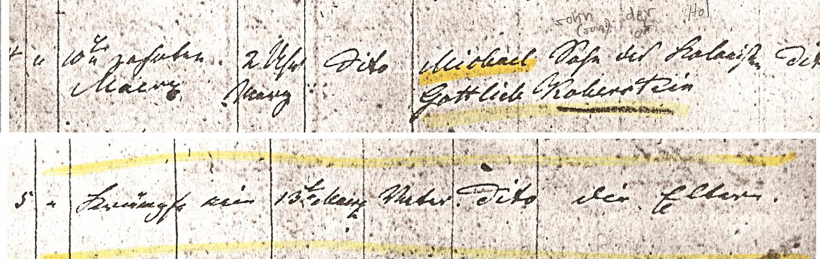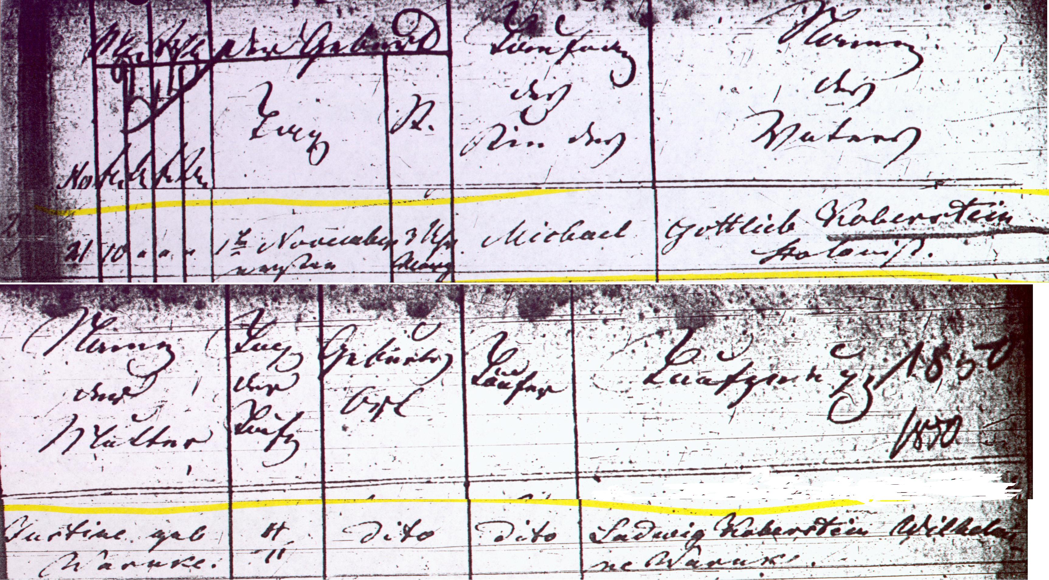 3Kirchenbuch, 1826-1874 Evangelische Kirche Obersitzko (Kr. Samter), Items 2-3 , LDS SLC FHL Int'l Microfilm, 1194740. "Michael Koberstein death 2 Nov 1868, Colonie Brinsk, Strasburg, West Prussia. Listed as son of Gottlieb." Image.