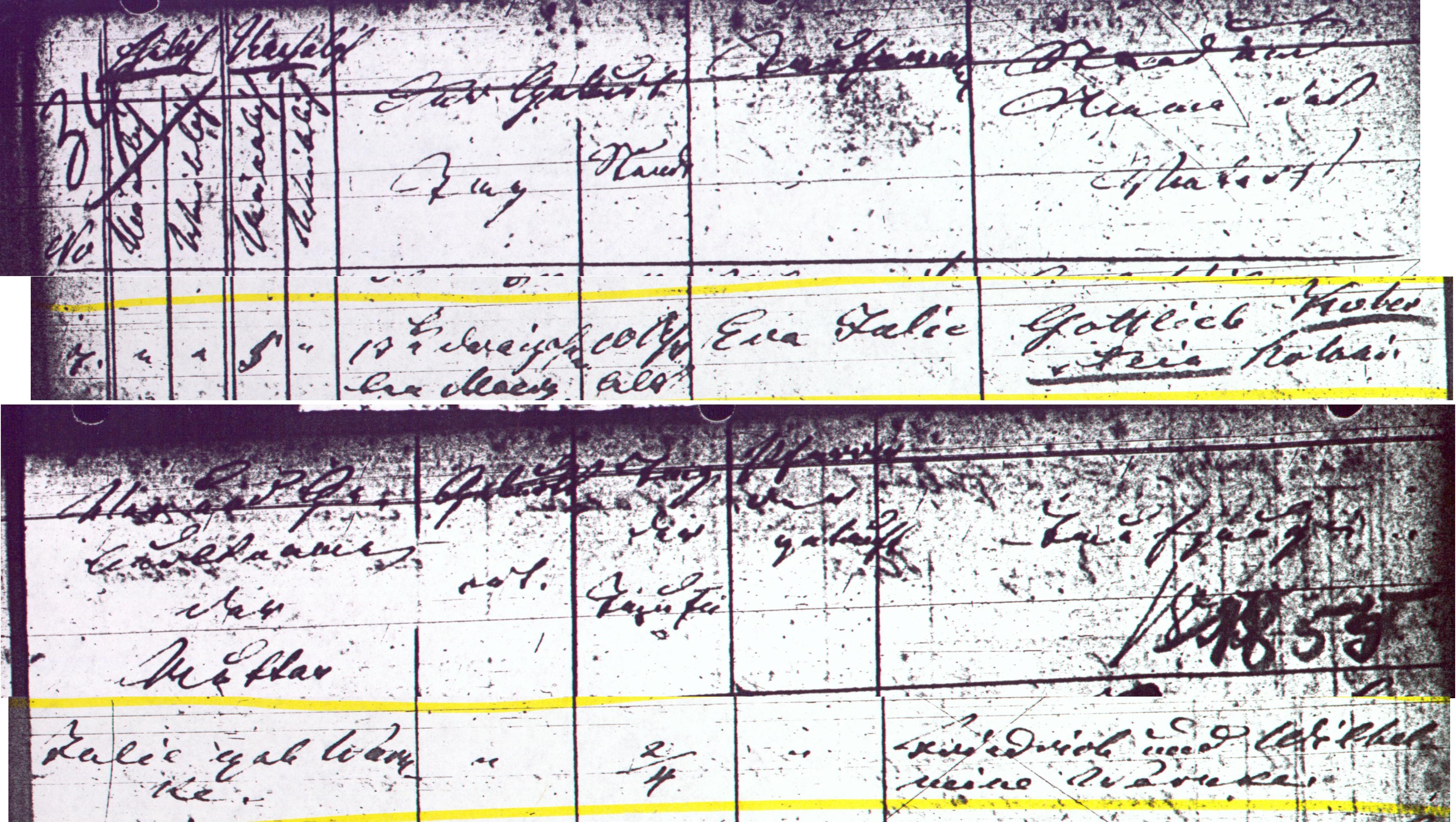 2Langendorf Kirchenbuch, Taufen 1842-1893 . "Eva Julie Koberstein christening 1855 at Colonie Brinsk, Strasburg, West Prussia." Researched - 7 Oct 2002. Image.