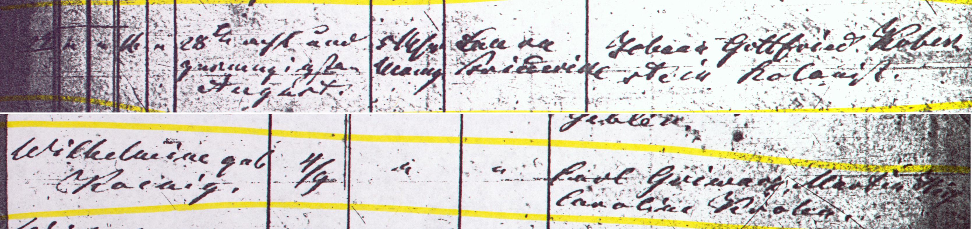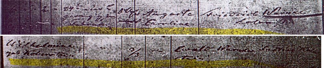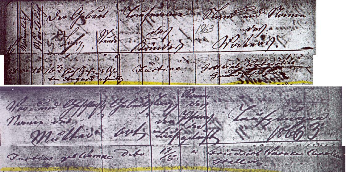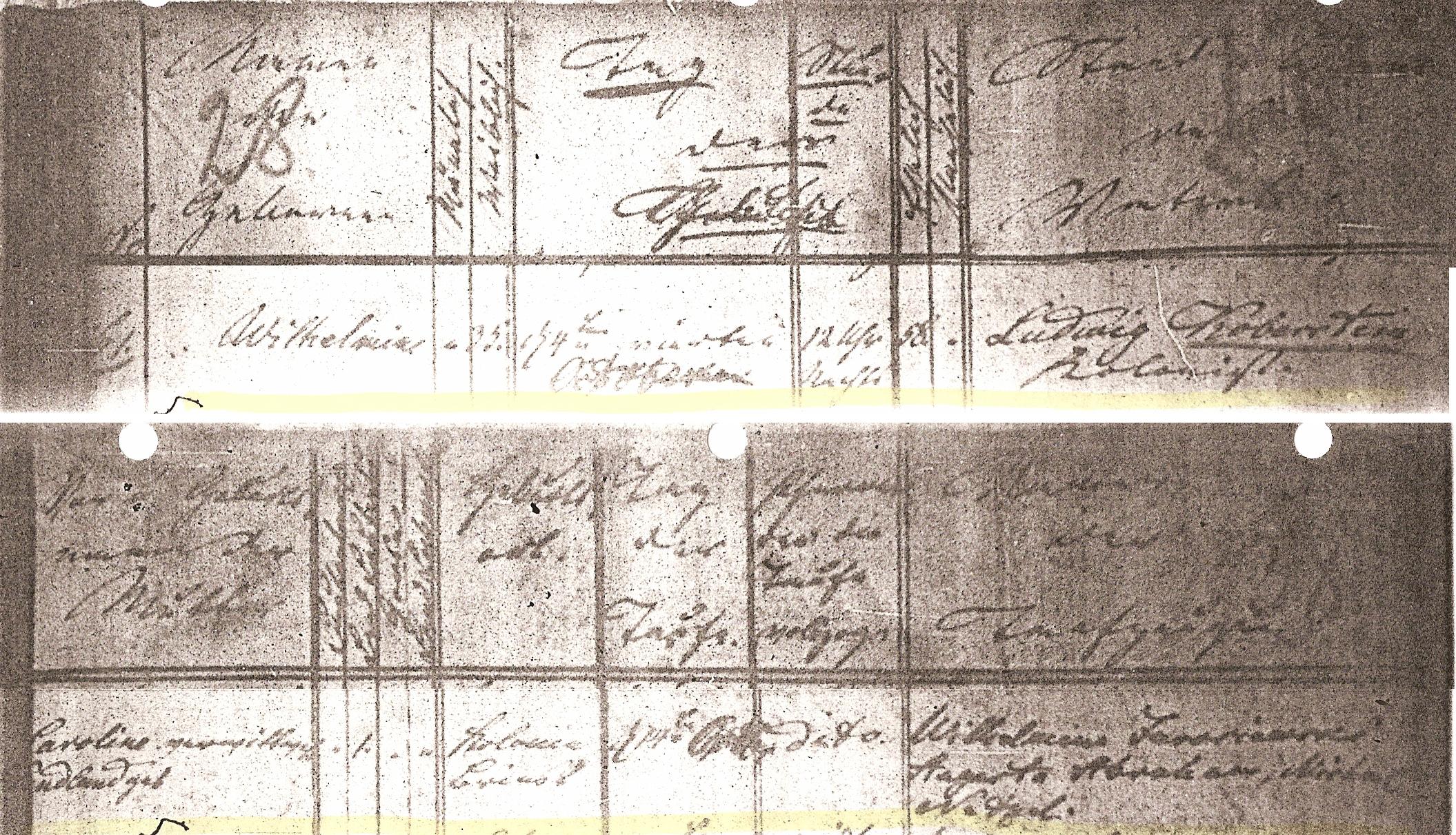 1Kirchenbuch, Taufen 1842-1893 Evangelische Kirche Langendorf (Kr. Strasburg) , LDS SLC FHL Int'l Microfilm, 245330. Poland, Olsztyn, Brynsk-Kolonia (Dzialdowo) - Church records. "Birth of Wilhelmine Koberstein daughter of Ludwig Koberstien and Caroline