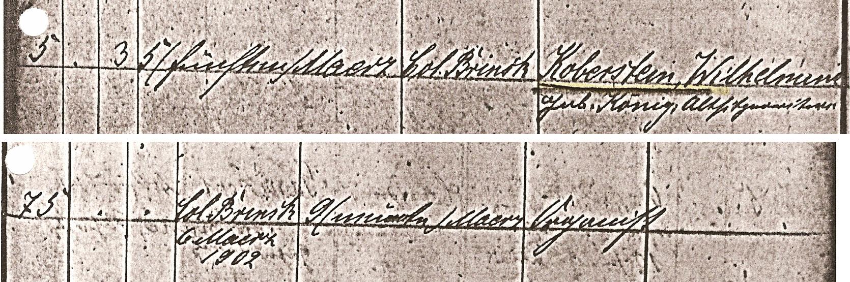 1Kirchenbuch, Tote 1842-1910 Evangelische Kirche Langendorf (Kr. Strasburg) , LDS SLC FHL Int'l Microfilm, 245330. Poland, Olsztyn, Brynsk-Kolonia (Dzialdowo) - Church records. "Wilhelmine Koberstein death on 5 Mar 1902 at Colonie Brinsk, Strasburg, West Prussia." Image.