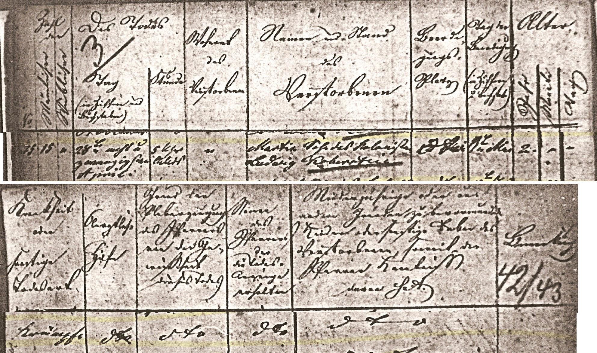 2Kirchenbuch, Tote 1842-1910 Evangelische Kirche Langendorf (Kr. Strasburg) , Page 42/43, LDS SLC FHL Int'l Microfilm, 245330. Poland, Olsztyn, Brynsk-Kolonia (Dzialdowo) - Church records. "Martin Koberstein death, 28 Apr 1842, Colonie Brinsk, Strasburg, West Prussia. Listed as son of Ludwig Koberstein." Image.