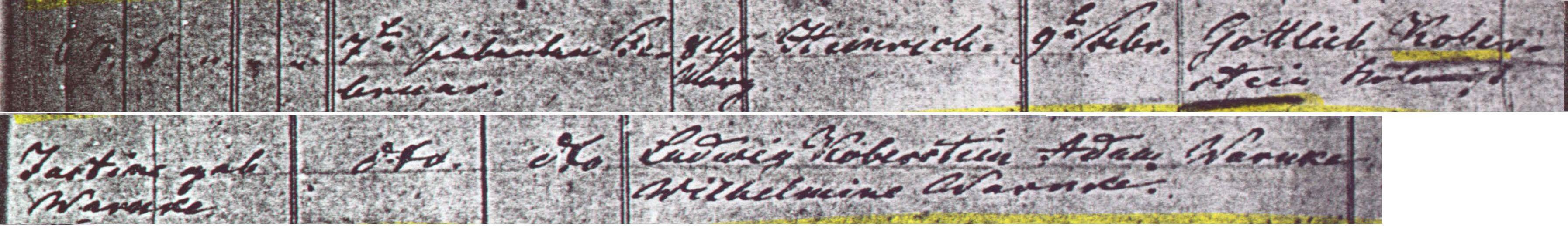 Godparents: Ludwig Koberstein, Adam Warnke, Wilhelmine Warnke." Researched - 6 Oct 2002. Image.2Langendorf Kirchenbuch, Taufen 1842-1893 . "Heinrich Koberstein christening 9 February 1845