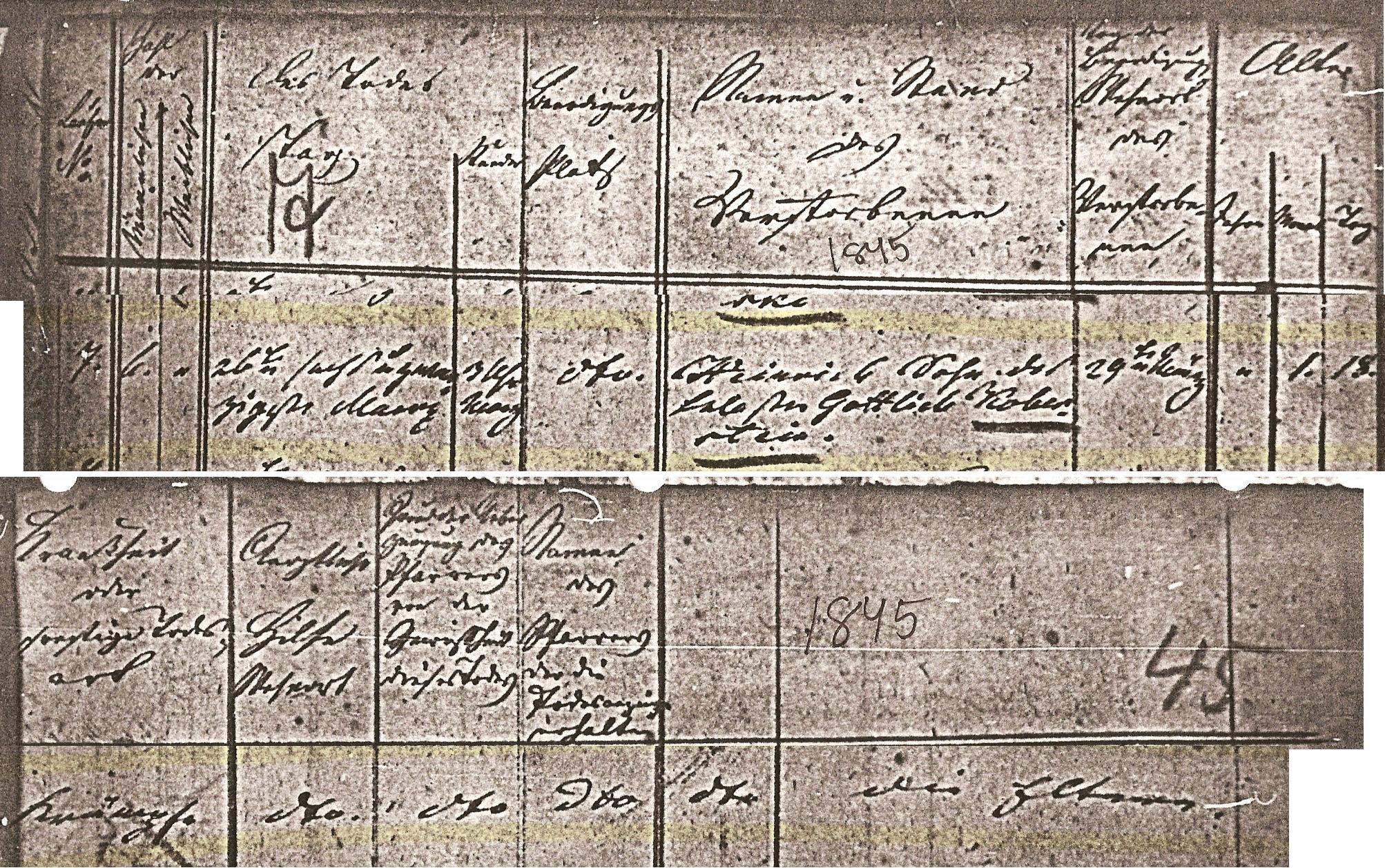 4Langendorf Kirchenbuch, Tote 1842-1910. "Burial on 29 Mar 1845 at Colonie Brinsk, Strasburg, West Prussia. Son of Gottlieb Koberstein." Researched - 19 Oct 2002. Image.