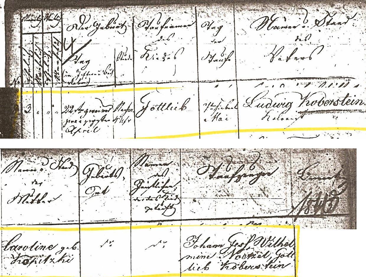 2Kirchenbuch, 1826-1874 Evangelische Kirche Obersitzko (Kr. Samter), Items 2-3 , Item 3, page 82, LDS SLC FHL Int'l Microfilm, 1194740. "Ernestine Emilie Hoffmann born on October 13, 1949 to Wilhelm Koberstein and Anna Justine Bittner." Researched - 16 Nov 1999.