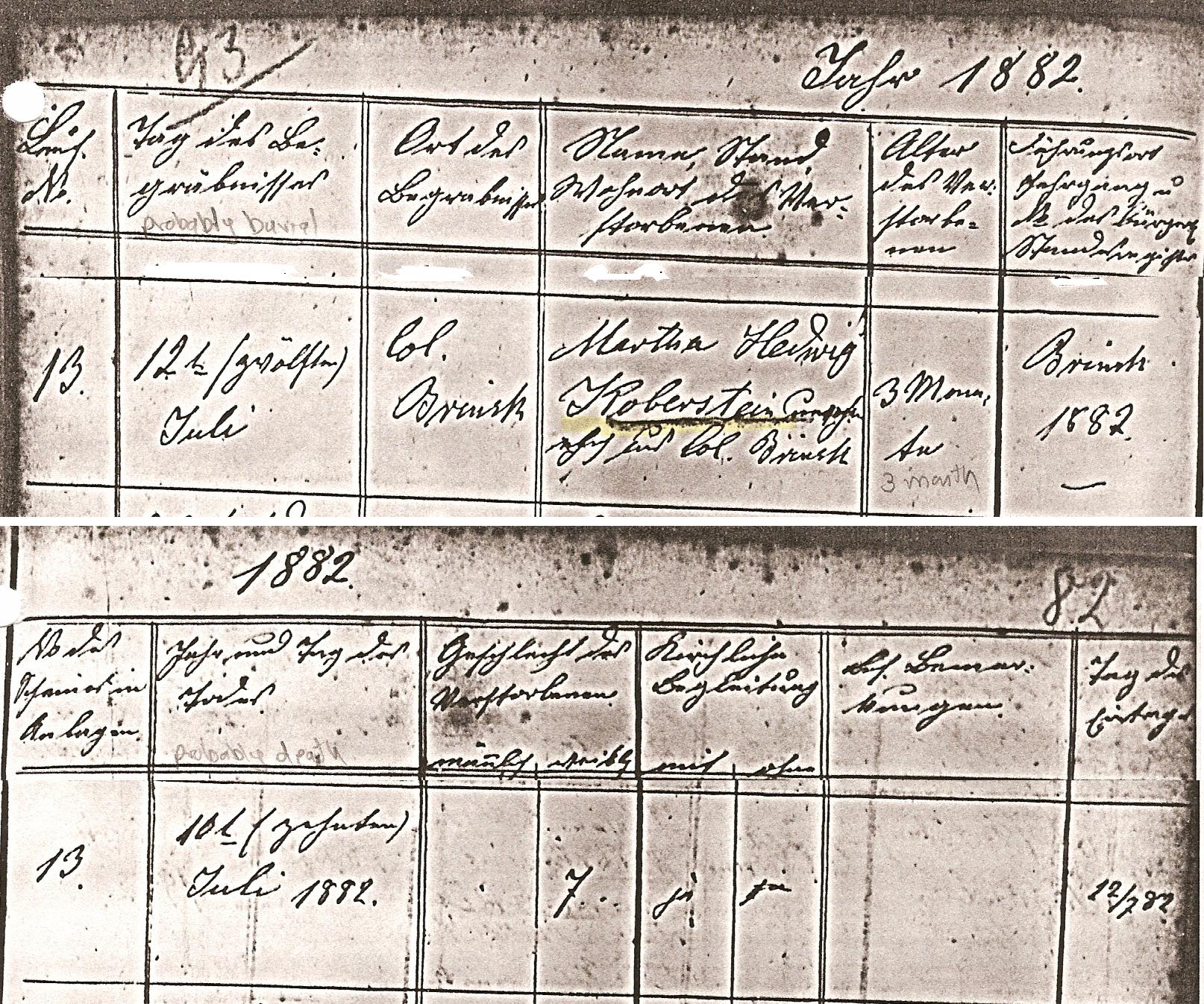 2Kirchenbuch, Tote 1842-1910 Evangelische Kirche Langendorf (Kr. Strasburg) , LDS SLC FHL Int'l Microfilm, 245330. Poland, Olsztyn, Brynsk-Kolonia (Dzialdowo) - Church records. "Martha Hedwig Koberstein death, 12 Jul 1882, Colonie Brinsk, Strasburg, West Prussia. "Daughter of Heinriette Koberstein."." Researched - 19 Oct 2002. Image.