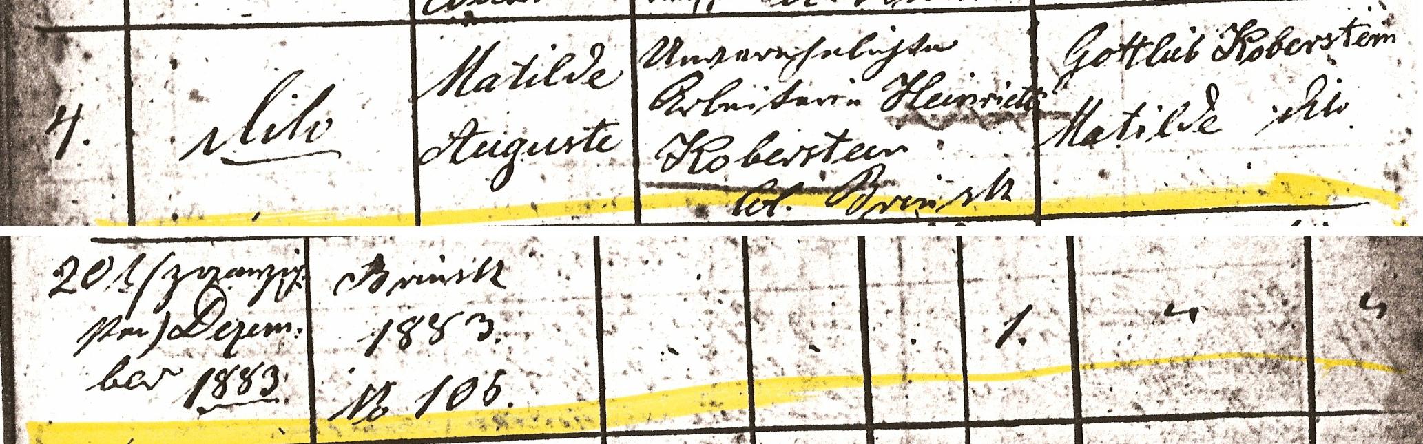 3Langendorf Kirchenbuch, Tote 1842-1910. "Matilde Auguste daughter of Henriette Koberstein." Image.