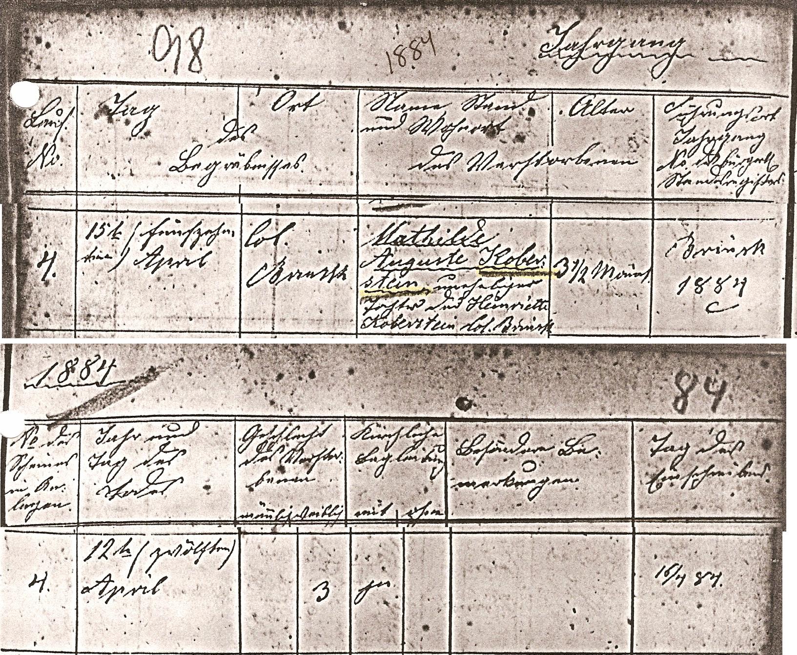 2Kirchenbuch, Tote 1842-1910 Evangelische Kirche Langendorf (Kr. Strasburg) , LDS SLC FHL Int'l Microfilm, 245330. Poland, Olsztyn, Brynsk-Kolonia (Dzialdowo) - Church records. "Matilde Auguste Koberstein death, 15 Apr 1884, Colonie Brinsk, Strasburg, West Prussia. "Daughter of Heinriette Koberstein."." Researched - 19 Oct 2002. Image.