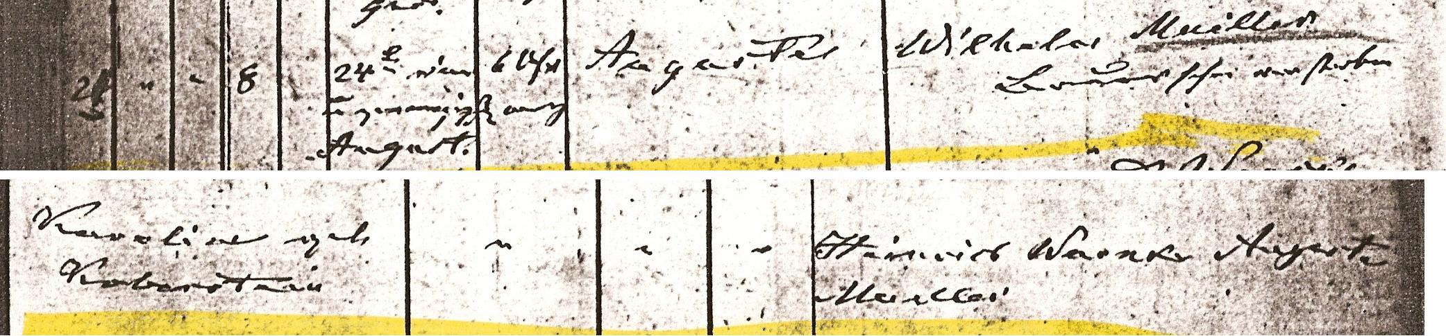 2Langendorf Kirchenbuch, Taufen 1842-1893 . "Auguste Mueller birth August 24, 1873 - Colonie Brinsk, Strasburg, West Prussia." Researched - 7 Oct 2002.
