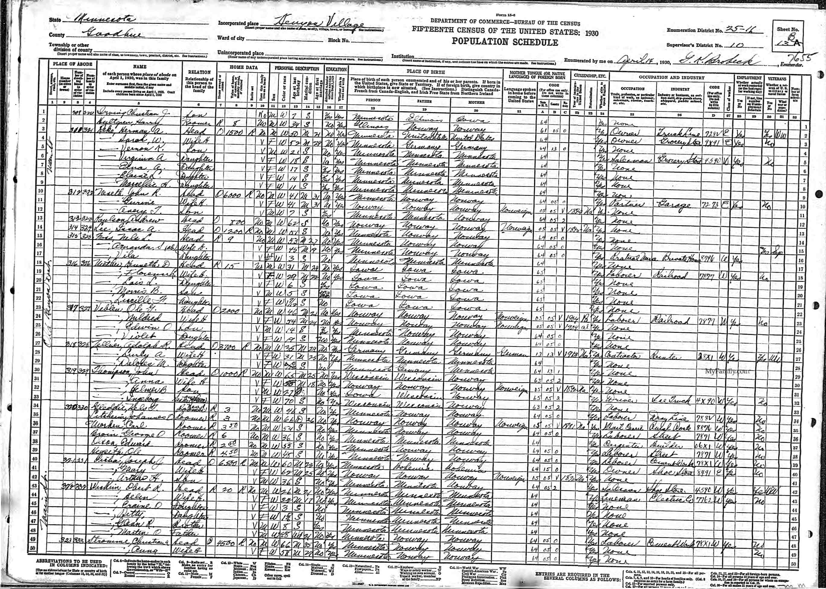 21930 US Census, MN, Ancestry.com. "1930 Census MN Goodhue Kenyon