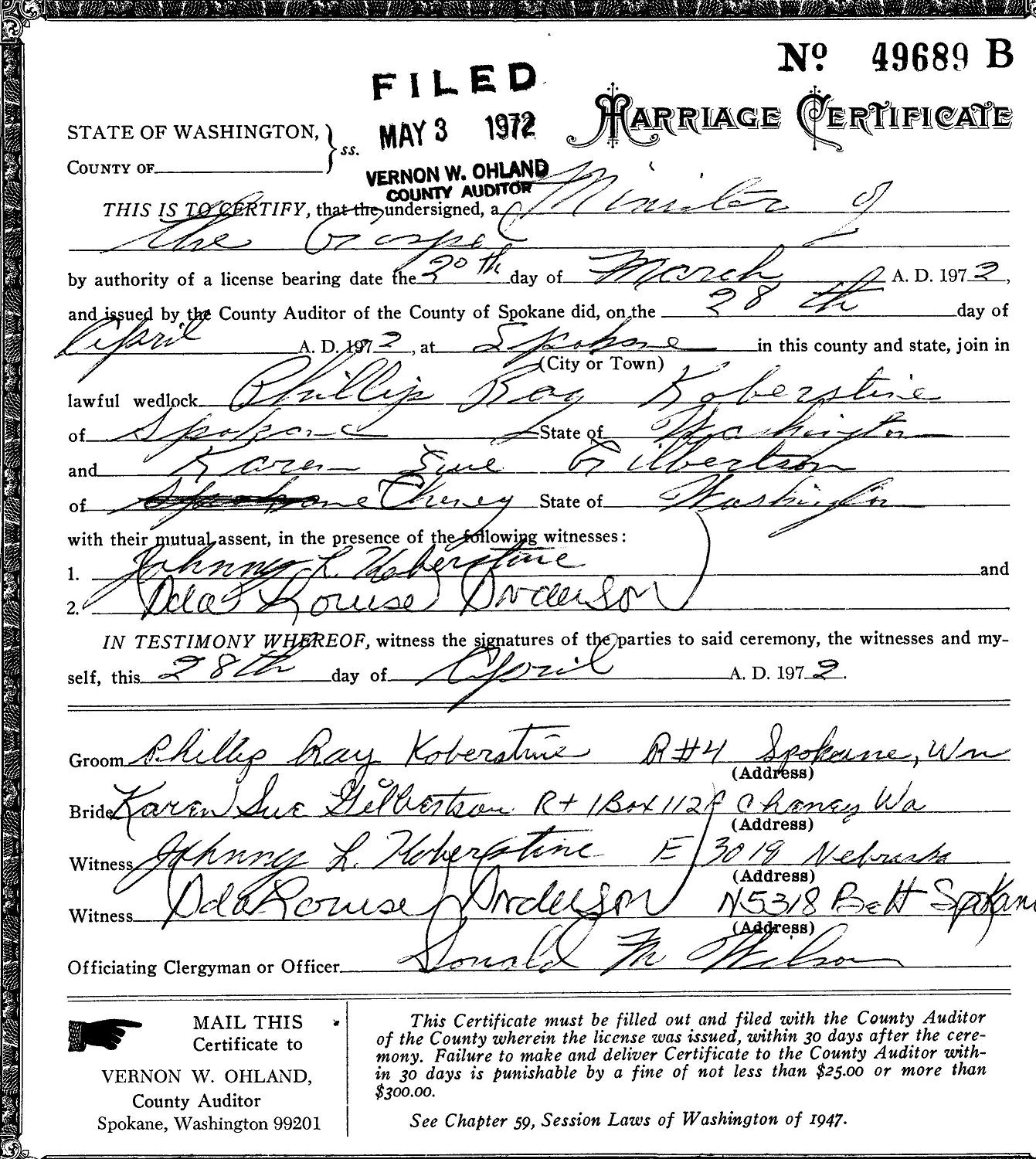 1Marriage Certificate, Terry L. Koberstein Possession, 817 Gloucester Street, Antioch, CA 94509. "Phillip Ray Koberstein