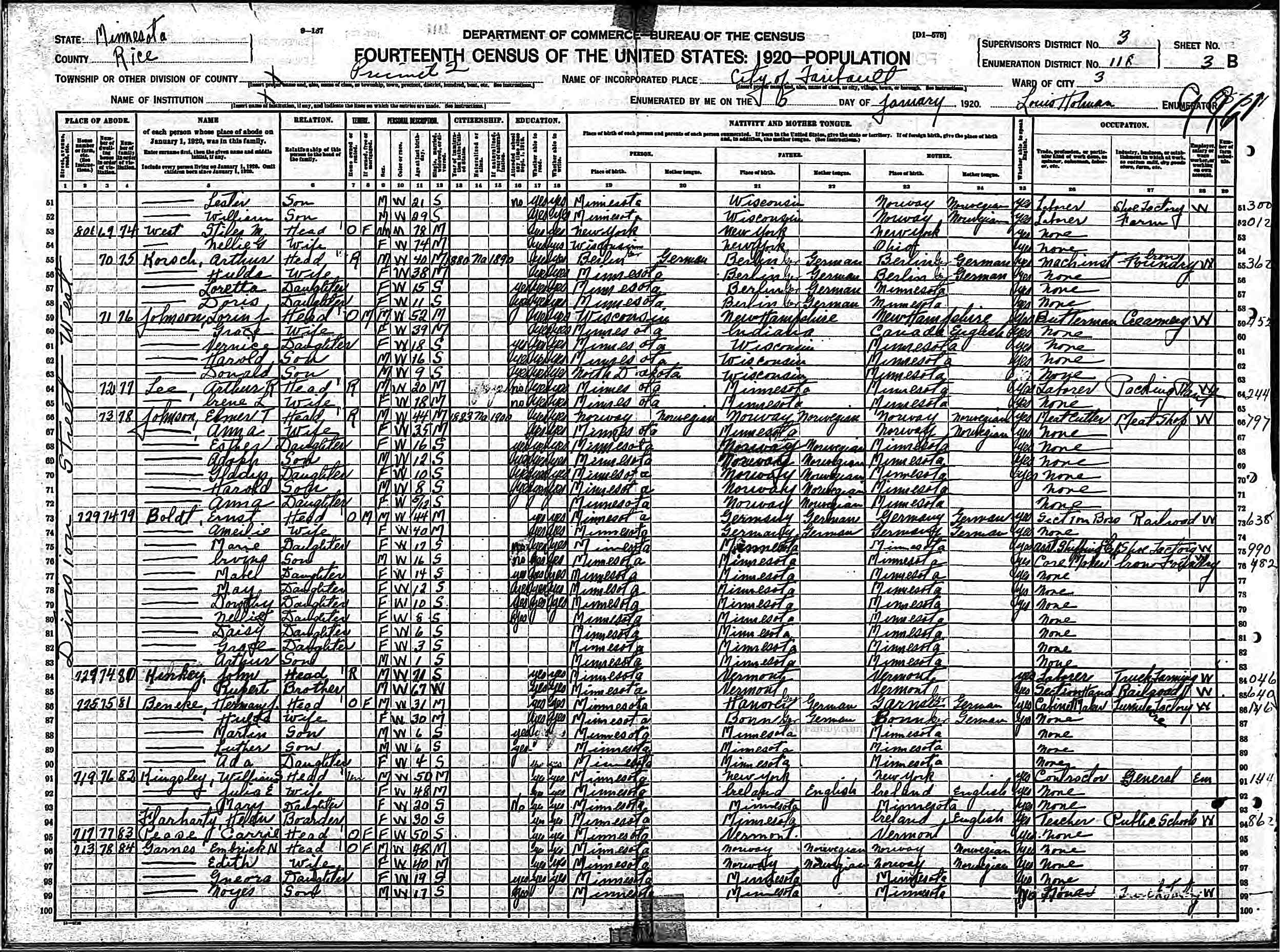 Faribault, Rice, Minnesota."21910 US Census, MN, Ancestry.com. "Arthur A. Korsch and family." Image.