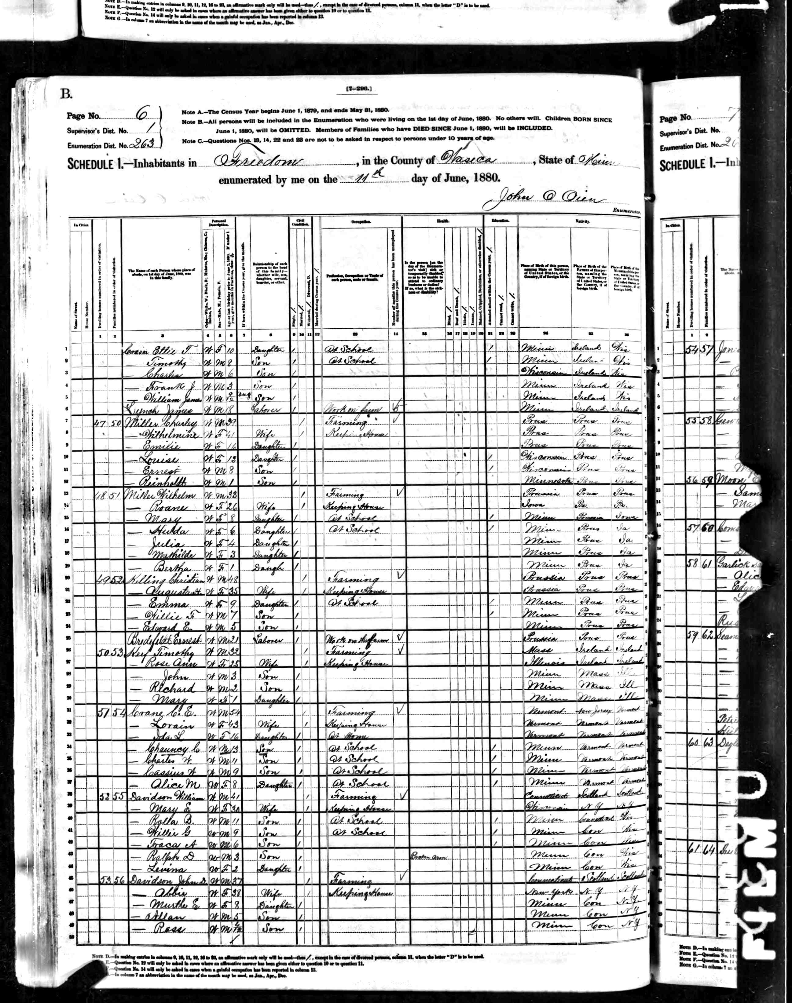 Section: V-47."31880 US Cencus, Minnesota, Ancestry.com. "Wilhelm Miller and Family including daughter Hulda." Image.