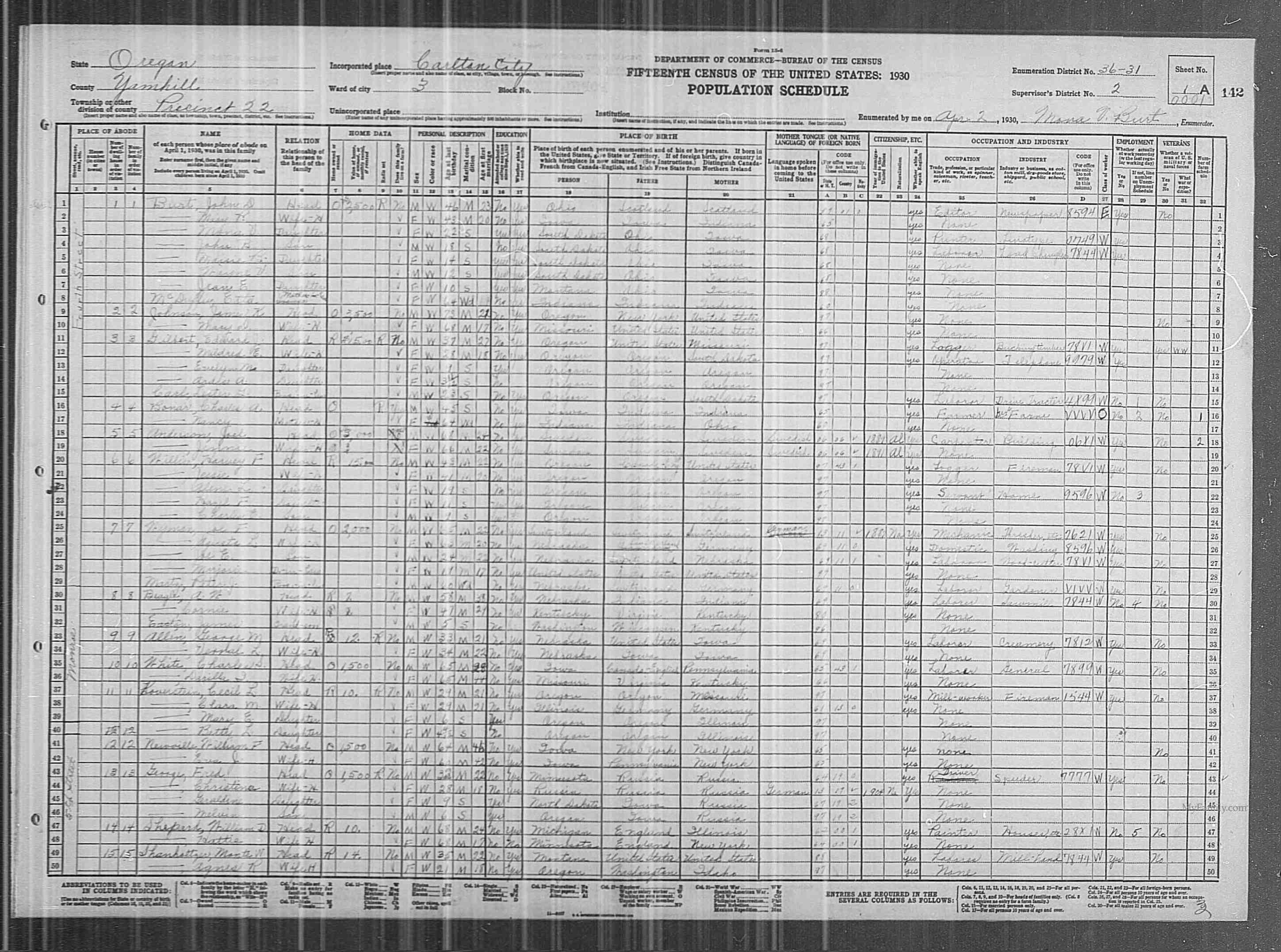 11930 US Cencus, Oregon, SD 2, ED 36-31, Sht 1A, Ancestry.com. "Name, Est. birth year, birth place