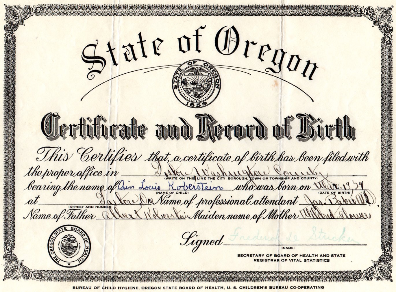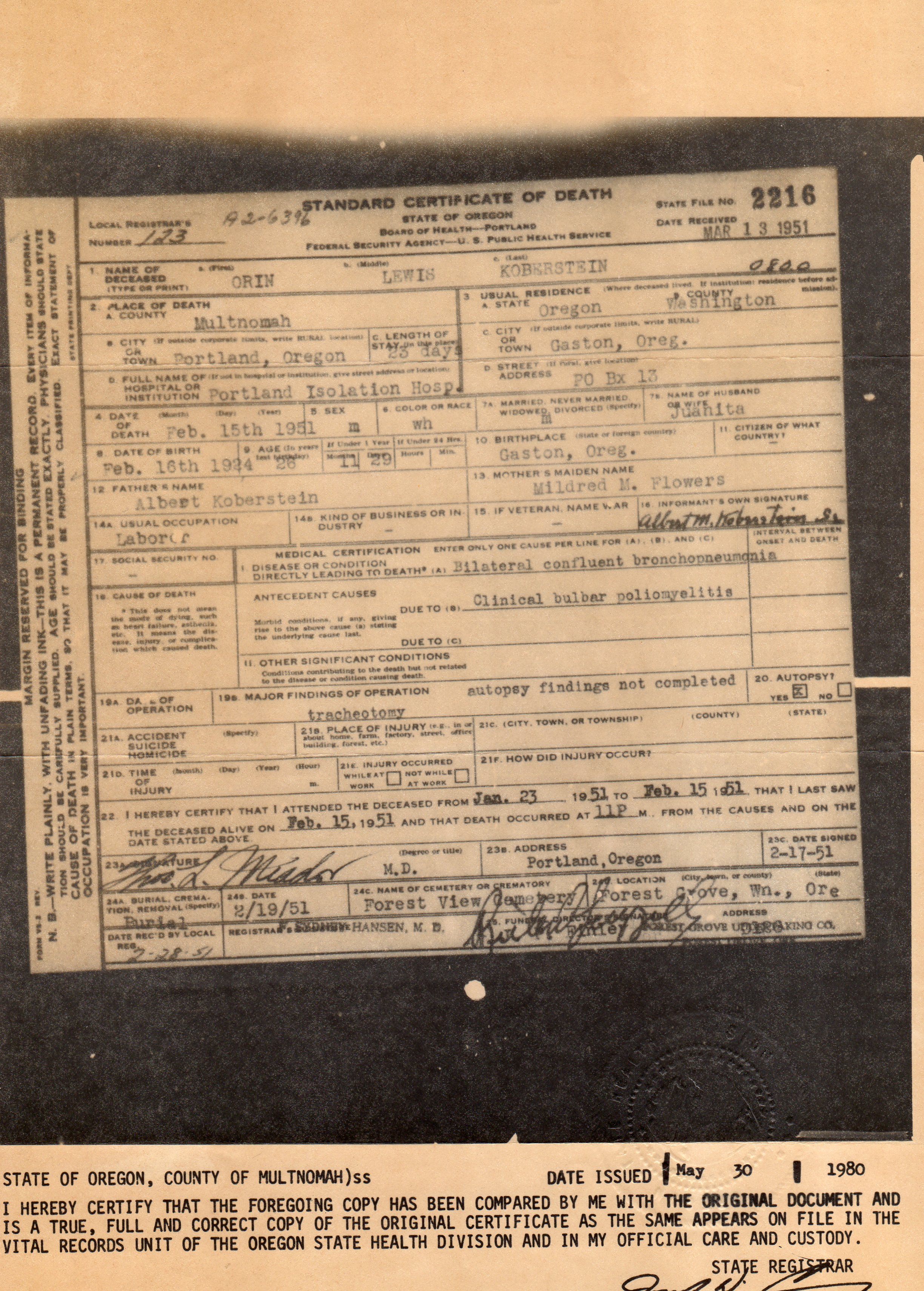Hospital Birth Certificate for Orin Louis Koberstein at Gaston, Washington county, Oregon. Image.8Death Registration Index, Oregon, 1921-1930 A-Z, The Oregon Historical Society, 1230 Southwest Park Avenue, Portland, OR 97206-2483. "Koberstein, Orin L - Juanita 26 2 15 51 2216.