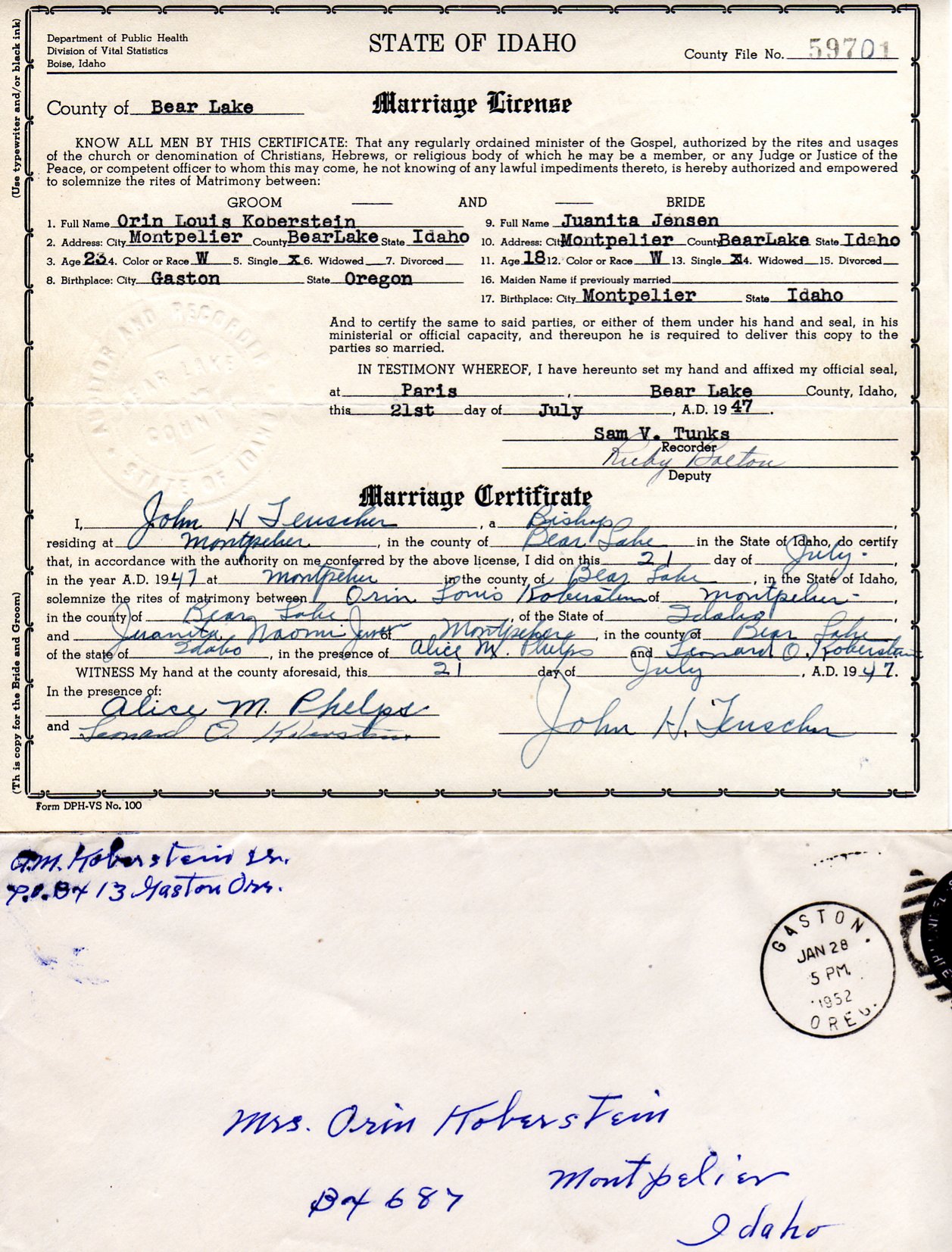 4Orin Louis Koberstein, "Idaho, Marriage Index, 1947-1961". "Idaho Marriage Index, 1947-1961," database, FamilySearch (https://familysearch.org/pal:/MM9.1.1/K8H6-DMZ), Juanita Jensen and Orin Louis Koberstein, 21 Jul 1947; citing Marriage, Bear Lake, Idaho, United States, certificate 01736, Idaho Bureau of Vital Records and Health Statistics, Boise. Image.