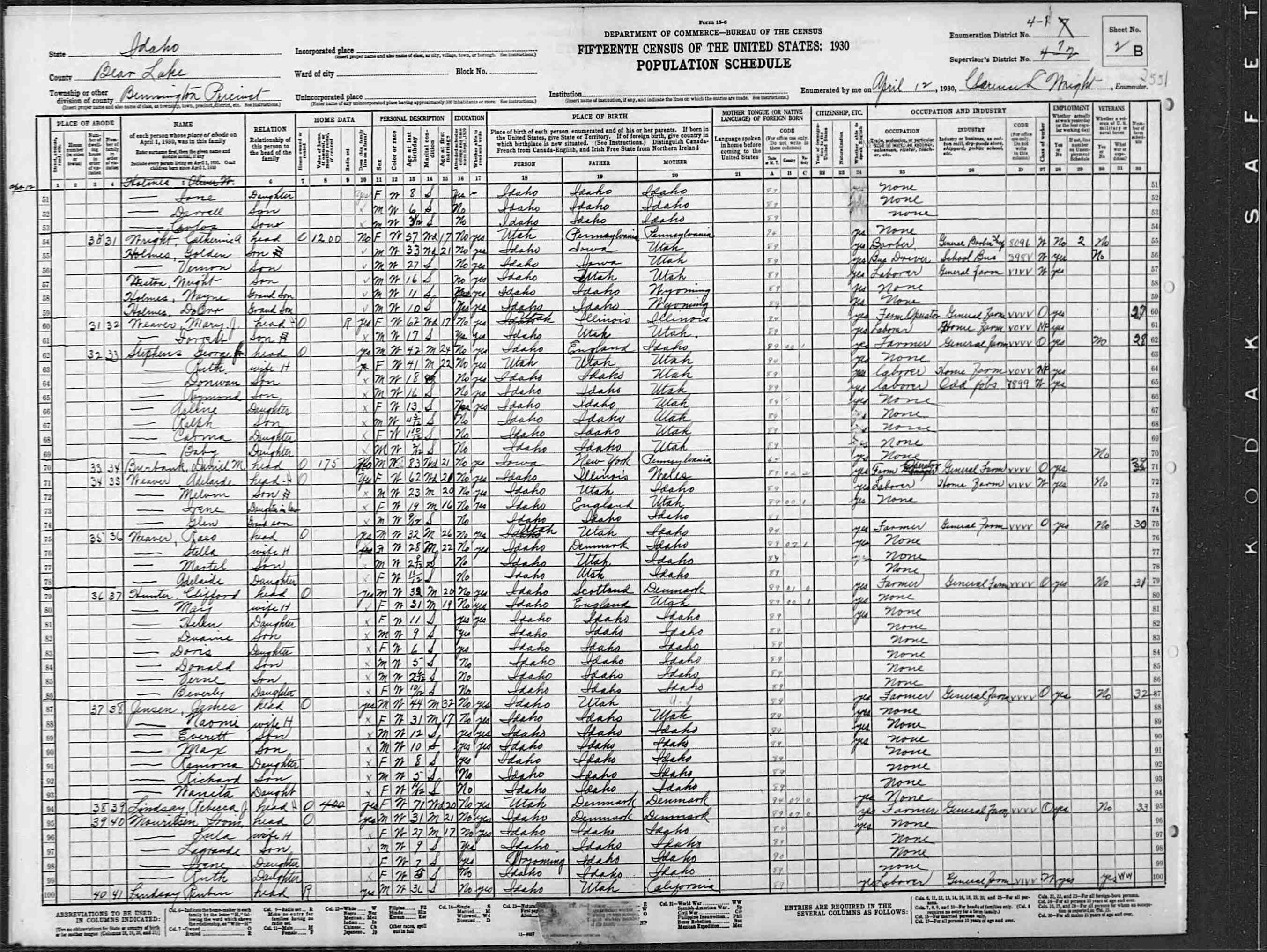 Image source: Year: 1930; Census Place: Bennington, Bear Lake, Idaho; Roll: 395; Page: ; Enumeration District: 1; Image: 918.0." See cencus image under father James Jensen.31930 US Cencus, ID, SD 7, ED 4-1, Sht 2B. "Name, Est birth year, birth place