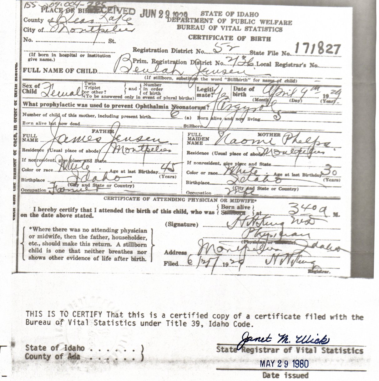 Wanita, 1929, Idaho." Image.4Birth Certificate, Terry L. Koberstein Possession, 817 Gloucester Street, Antioch, CA 94509. "Beulah (Wanita or Juanita) Jensen Birth Certificate." Image.
