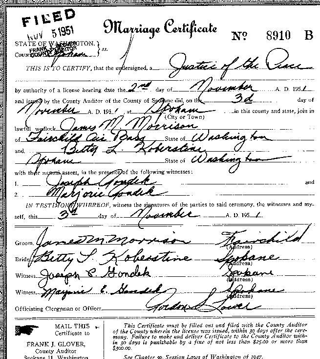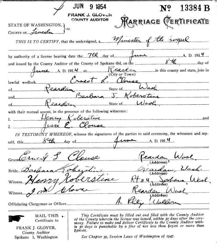 1Marriage Certificate, Terry L. Koberstein Possession, 817 Gloucester Street, Antioch, CA 94509. "Orin Koberstein and Wanita (Juanita) Jensen marriage certificate." Image.