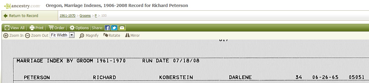1Oregon, Marriage Indexes, 1906-2008, 28 Mar 2012, Ancestry.com. "