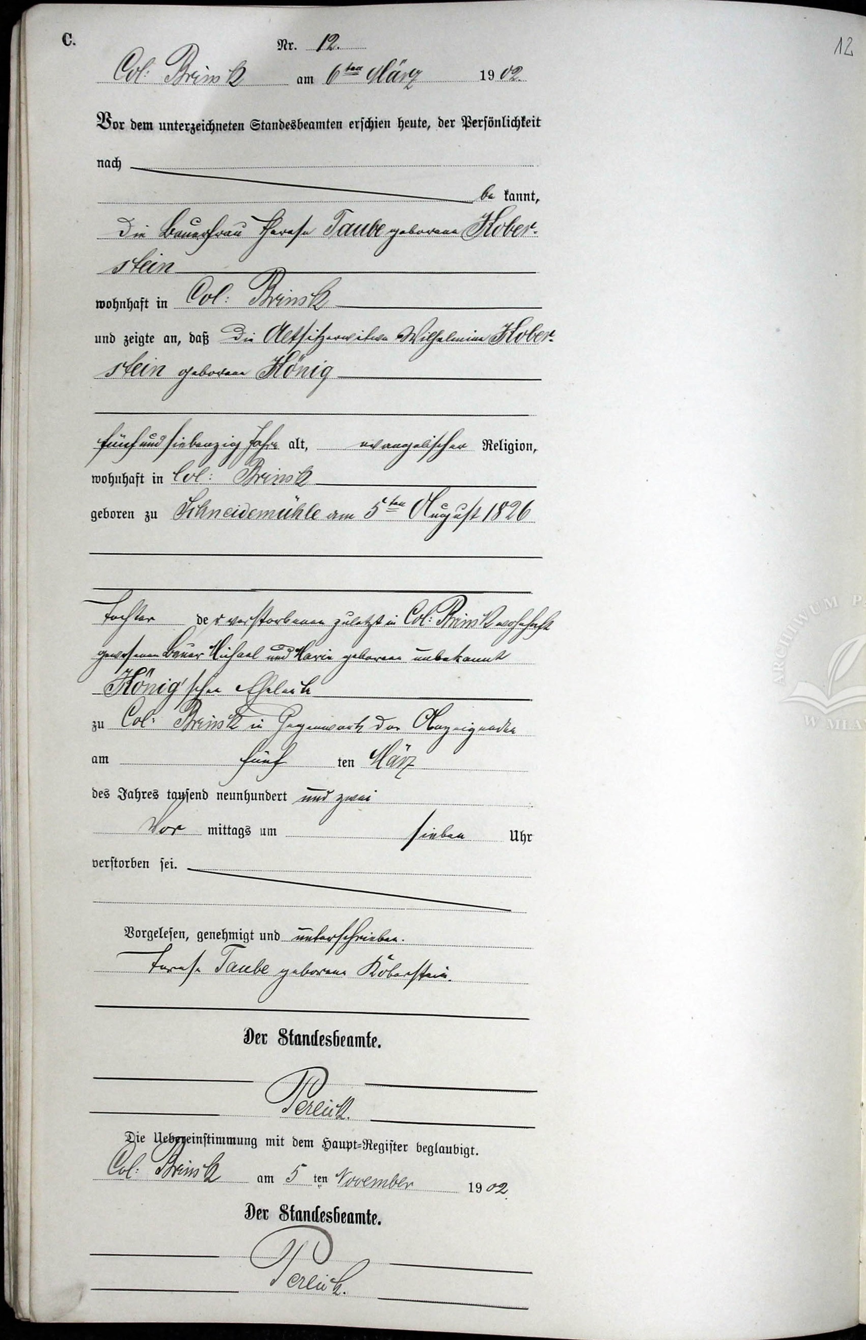 Johann KOBERSTEIN was born on 30 Oct 1852 1 in Colonie Brinsk, Strasburg, West Prussia 1. He was christened in 1852 2 in Langendorf, Strasburg, West Prussia 2. He died on 18 Jan 1853 3 in Colonie Brinsk, Strasburg, West Prussia 3.[Notes] + 27 F ii Augusta KOBERSTEIN was born on 18 May 1854. She died on 4 Nov 1895. + 28 M iii William KOBERSTEIN was born on 2 May 1855. He died on 31 Oct 1934. 29 F iv