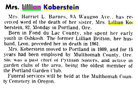 Leon married 1 Lillian Bri. BRITTON "Lilly", daughter of Gustav BRITTON "Gusta" and Ida LOPNO, on 21 Oct 1911 in Portland, Multnomah, Oregon. Lilly was born 2 on 27 Jul 1883 in Wisconsin 3. She died on 23 Feb 1976 4 in Portland, Multnomah, Oregon 4.[Notes] 78 F viii