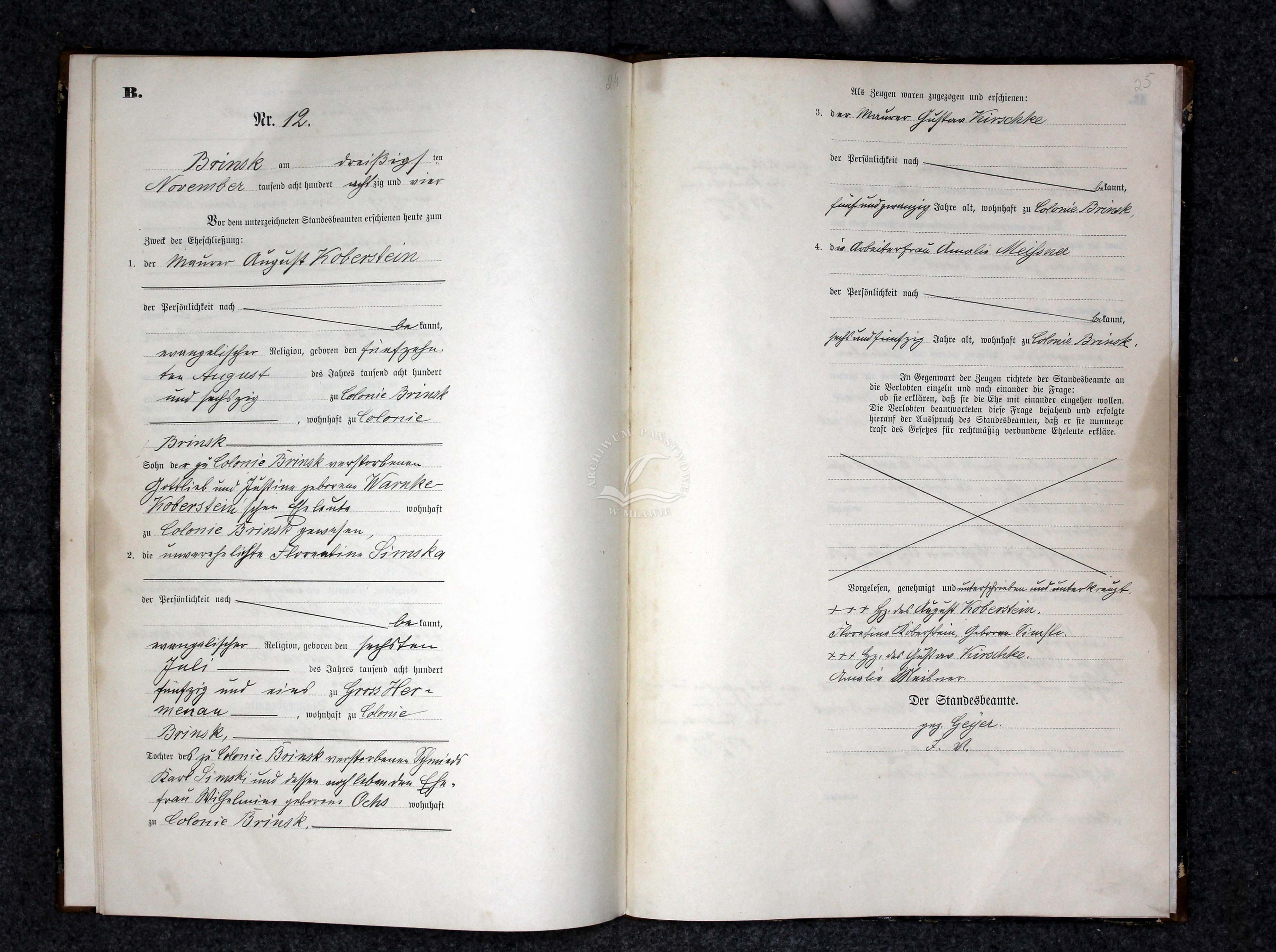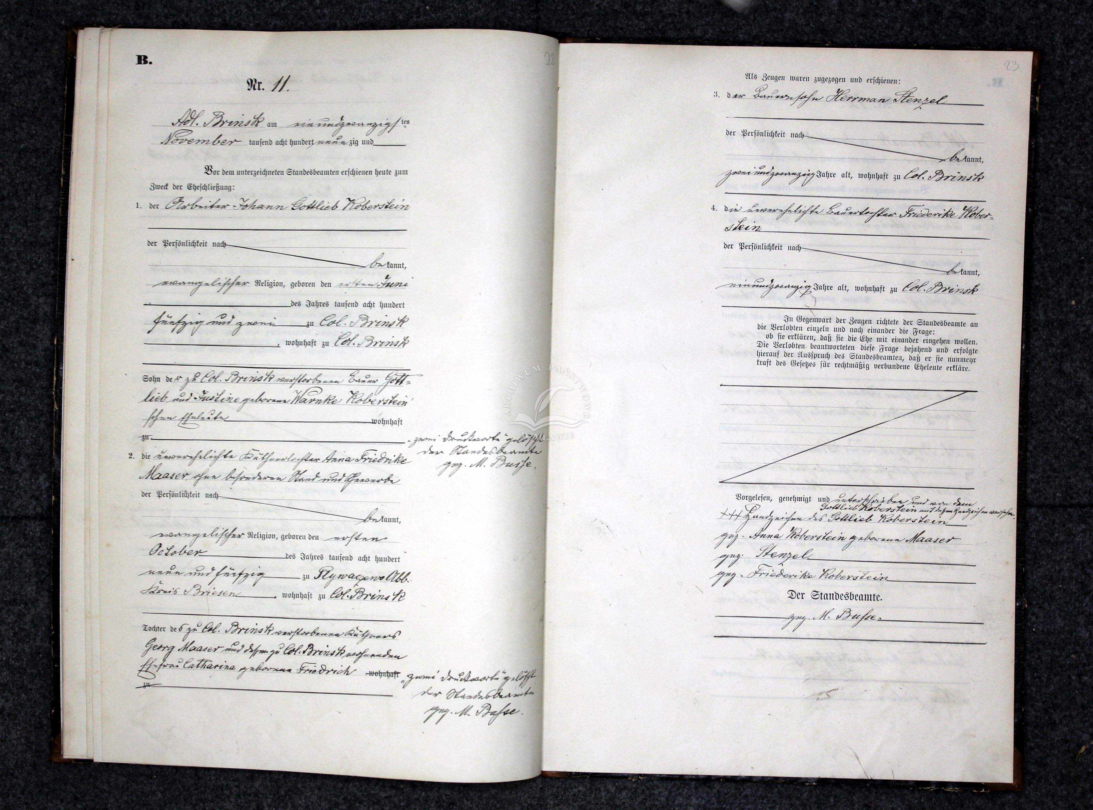 Johann married Anna Friederike MAASER, daughter of Georg MAASER and Caroline FRIEDRICH, on 21 Nov 1890 in Adlig Brinsk, Strasburg, West Prussia. Anna was born on 1 Oct 1859 in Plywaczewo, Briesen, West Prussia, Prussia, Germany. [Notes] |