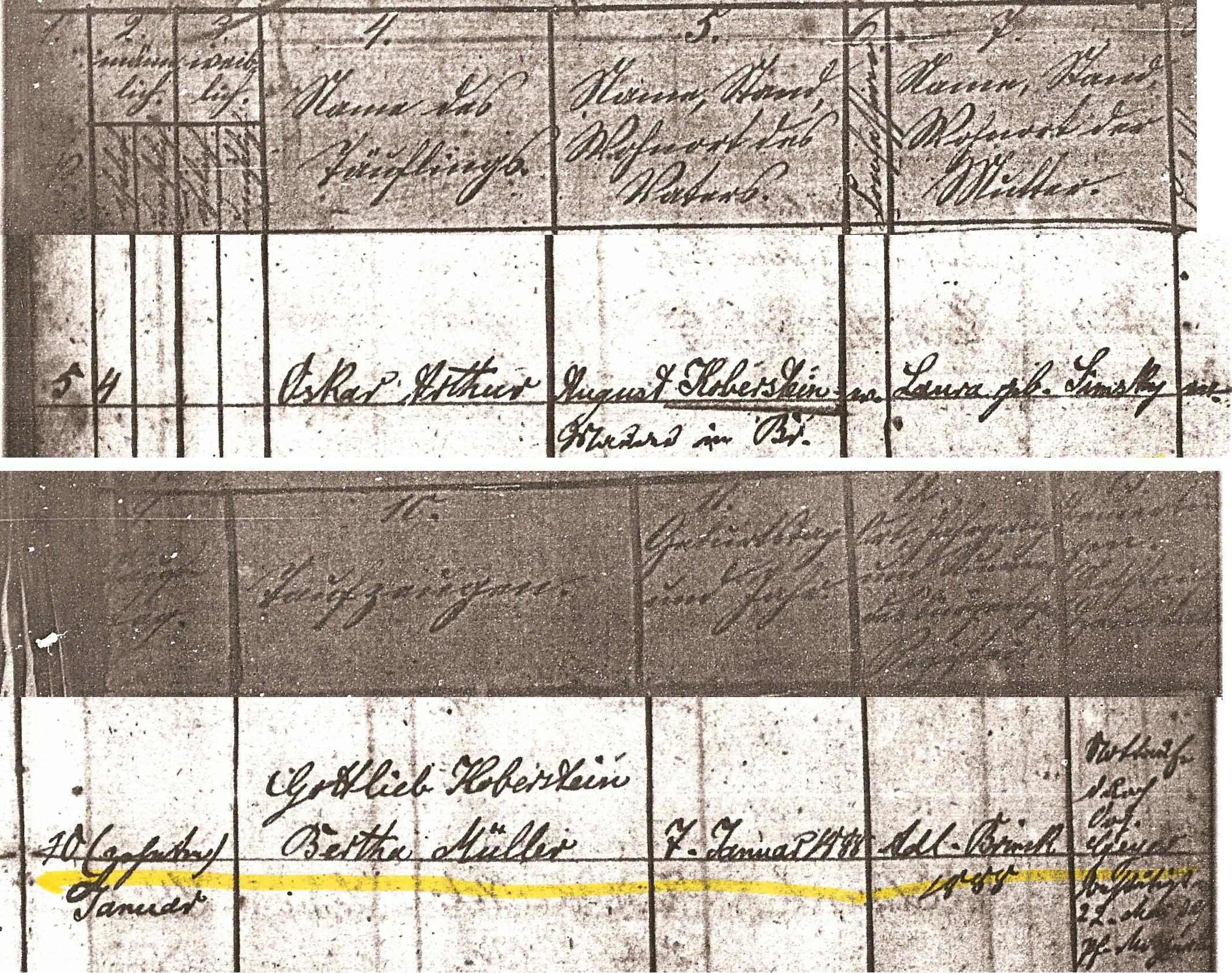 Oskar Arthur KOBERSTEIN was born on 7 Jan 1888 1 in Adlig Brinsk, Strasburg, West Prussia 1. He was christened on 10 Jan 1888 2 in Adlig Brinsk, Strasburg, West Prussia 2.[Notes] + 95 F iv Louise Helen KOBERSTEIN was born on 21 May 1890.