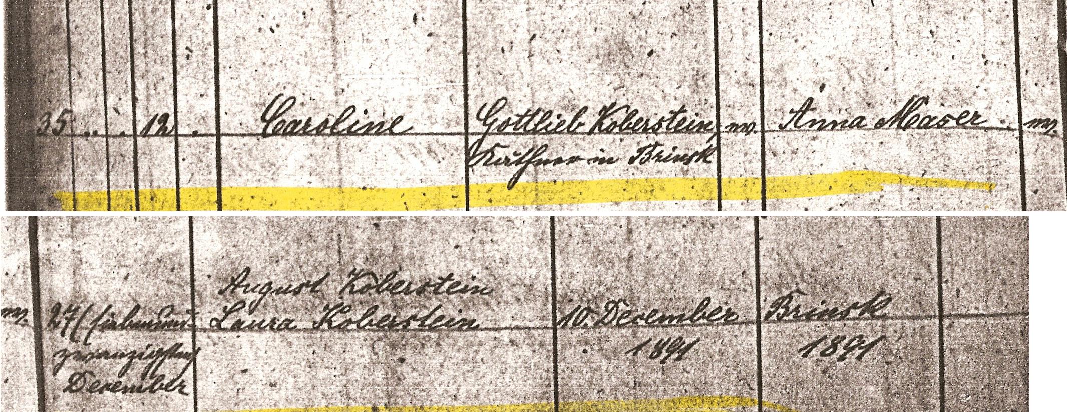 Caroline KOBERSTEIN was born on 10 Dec 1891 1 in Brinsk, Strasburg, West Prussia 1. She was christened on 27 Dec 1891 2 in Brinsk, Strasburg, West Prussia 2. She died in 1892.[Notes] 91 M iii